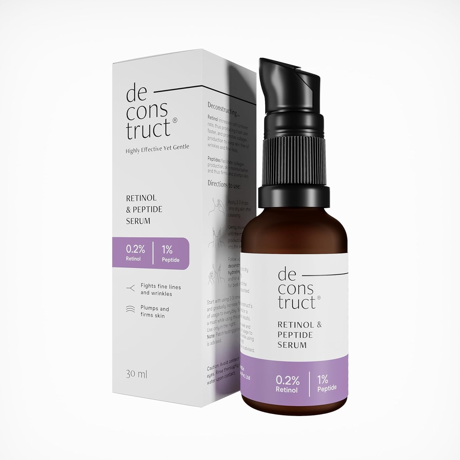 Safety Information: Patch test prior to use is advised. Avoid using on broken skin. Best suited for individuals above 25 years of age. Discretionary use during pregnancy. Indications: Fights signs of aging, boosts collagen production, and plumps and firms the skin Ingredients: Aqua, Rosa Damascena Flower Water, Pisum Sativum (Pea) Extract, Pentylene Glycol, Lecithin, Retinol, Betaine, Polysorbate 20, Potassium Phosphate, Glycerin, Phenoxyethanol, Ethylhexylglycerin, Palmaria Palmata Extract, Xanthan Gum, Amylopectin, Magnesium Aspartate, Zinc Gluconate, Copper Gluconate, Sodium Gluconate, Hyaluronic Acid, Tocopheryl Acetate Directions: Apply 2-3 drops to dry skin after cleansing. Gently massage until the entire product is absorbed into the skin. Use of moisturizer is mandatory after using this product. It is recommended to use in night skincare routine only Start using 2-3 times a week and slowly increase the frequency of usage to every day.SAFE EFFECTIVE FORMULATION: This facial serum is fragrance-free, paraben-free, and cruelty-free. USAGE: Start with 2-3 times per week gradually increase frequency of usage to everyday, preferable as a night serum. Always follow up with a moisturizer for face. SUITED FOR ALL SKIN TYPES: This face retinol peptide serum is proven safe for all skin types: oily, normal, dry sensitive. Designed for both men women. FIRMER AND PLUMPER SKIN: 1 Peptides Serum acts as a framework for skin proteins by facilitating collagen production, skin moisturization providing firmer and plumper skin. FACE ANTI AGING SERUM: 0.2 Retinol serum for face increases the cell turnover rate slows down the skin's aging process thus producing fresh skin faster, to keep various signs of aging at bay. UNIQUE FORMULATION: Retinol and Peptides face serum works effectively on skin's collagen production thus acting as an anti-aging serum.