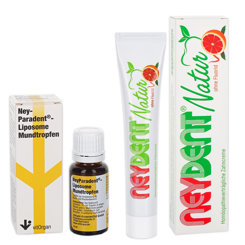 : Biologically active against gum problems. NeyParadent oral drops naturally strengthen the oral mucosa and dentures. Targeted and beneficial: Liposomes (fine fat droplets) deliver the active ingredients of NeyParadent oral drops precisely where they need to act. This significantly enhances the therapeutic effect of the regenerative factors. The nourishing composition of NeyParadent Liposome oral drops with an antibacterial formula contains refined active ingredients of chamomile, arnica, and myrrh, known for their anti-irritant effects. Versatile and very easy to use: NeyParadent Liposome oral drops can be applied undiluted to the affected area with a cotton swab or diluted for use as a mouthwash. Adding them to a water flosser is also possible. Ingredients: Aqua, Propylene Glycol, PEG-40 Hydrogenated Castor Oil, Ascorbic Acid, Sodium Salicylate, Aroma, Sodium Hydroxide, Chamomilla Recutita Flower Extract, Maltodextrin, Alcohol, Commiphora Myrrha, Maris Sal, Sodium Saccharin, Arnica Montana Flower Extract, Dextrin, Silica, Phosphatide, Ilcholine, Ascorbyl Palmitate, Tocopherol, Thymus Extract, Heart Extract, Umbilical Extract, Placental Extract, Tocopheryl Acetate, Disodium Phosphate, Cholesterol, Sodium Phosphate, Folic Acid, Limonene, LinaloolThe perfect complement to brushing your teeth. Against plaque bacteria: These mouth drops actively and specifically combat plaque bacteria in the mouth thanks to liposomes (the finest fat droplets) and naturally strengthen the oral mucosa. Healthy oral flora: Thanks to its antibacterial formula combined with valuable ingredients such as chamomile, arnica, and myrrh, it promotes a healthy oral flora and ensures fresh breath, even on the go. Medical dental care: NEYPARADENT Liposome mouth drops actively promote the health and maintenance of your teeth and gums. Antibacterial mouth drops: NEYPARADENT Liposome mouth drops are antibacterial and effectively protect against gum inflammation and mouth sores.Description du produit Biologiquement actif contre les problèmes de gencives Les gouttes buccales NeyParadent renforcent naturellement la muqueuse buccale et l'appareil dentaire. Ciblé et bénéfique : les liposomes (gouttelettes de graisse fines) transportent les facteurs actifs des gouttes buccales NeyParadent là où ils doivent agir. Cela renforce sensiblement l'effet thérapeutique des facteurs de régénération. La composition nourrissante des gouttes buccales NeyParadent Liposome avec formule antibactérienne contient des principes actifs raffinés de camomille, d'arnica et de myrrhe, connus pour leurs effets anti-irritations. Polyvalent et très facile à utiliser : les gouttes buccales NeyParadent Liposome peuvent être appliquées avec un coton-tige non dilué sur la zone concernée ou diluées pour les bains de bouche. L'ajout à l'hydropulseur est également possible. Ingrédients Aqua, Propylene Glycol, PEG-40 Hydrogenated Castor Oil, Ascorbic Acid, Sodium Salicylate, Aroma, Sodium Hydroxide, Chamomilla Recutita Flower Extract, Maltodextrine, Alcohol, Commiphora Myrrha, Maris Sal, Sodium Saccharin, Extrait de fleur d'arnica Montana, dextrine, silice. phosphatide. ylcholine, palmitate d'ascorbyl, tocophérol, extrait de thymus, extrait de cœur, extrait Umbilical, extrait placental, acétate de tocophérol, phosphate disodique, cholestérol, phosphate de sodium, acide folique, limonène, linalolLe complément parfait pour le brossage des dents. Contre les bactéries de la plaque dentaire : les gouttes buccales combattent activement et de manière ciblée les bactéries de la plaque dentaire dans la bouche grâce aux liposomes (gouttelettes de graisse les plus fines) et renforcent naturellement la muqueuse buccale. Flore buccale saine : grâce à sa formulation antibactérienne associée à des ingrédients précieux tels que la camomille, l'arnica et la myrrhe, favorise une flore buccale saine et assure une haleine fraîche même en déplacement. Soins dentaires médicaux : les gouttes buccales NEYPARADENT Liposome favorisent activement la santé et le maintien de vos dents et de vos gencives. Gouttes buccales antibactériennes : les gouttes buccales NEYPARADENT Liposome sont antibactériennes et protègent efficacement contre les inflammations des gencives et les inflammations de la bouche.1 goutte à bouche NEYPARADENT Liposome 1 dentifrice NeyDent Nature