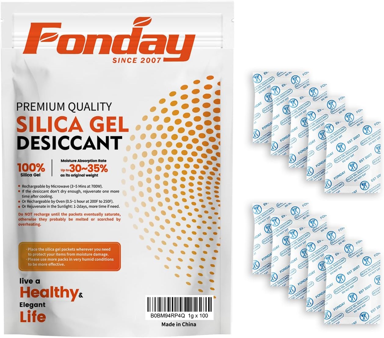 [How to use] Place your Items and Silica Gel Packets in A Tightly Sealed Container to Protect Your Item's From Moisture Damage;Use Silica Gel Packs to Protect Foods, Vitamins, Medications, Nuts, Seeds, Snacks, Spices, Pet Foods, 3D Filamentents, Guns, Canister, Collectables, Jewelry, Documents, Camera Lens, Clothes, Shoes, Cosmetics, Books, Bags, Decorations, Cameras, Watches, Electronics, and many other Valuables etc. [High Moisture Absorption] with high Moisture absorption up to 35% as their Own Weight.White Silica Gel Beads;These packets do not contain indicating beads and will not change color when they are saturated;.[Food grade silica gel] cobalt chloride free, our packet material was tested under strict regulation for food specifications, can be used with foods and pharmaceuticals.[WARRANTY Information] Our Products are supported with new replacement or full refund if they don't.[Packet Specification] Dimension of Each Packet: 1.2inch x 1.4inch;1 Gram Desiccant Each Packet Can Cover Approximately 0.5l or 0.15gl Volume Containers;We Recommend Placing more packets Than Recommended for Extra Protection.[How To Use] Place your items and silica gel packets in a tightly sealed container to protect your items from moisture damage; Use silica gel packs to protect foods, vitamins, medications, nuts, seeds, snacks ,spices, pet foods, 3D filaments, guns, canister, collectables, jewelry, documents, camera Lens, clothes, shoes, cosmetics, books, bags, decorations, cameras, watches, electronics, and many other valuables etc. [High Moisture Absorption] With high moisture absorption up to 35% as their own weight. White silica gel beads; These packets do not contain indicating beads and will not change color when they are saturated;. [Food Grade Silica Gel] Cobalt chloride free, Our Packet Material was Tested under Strict Regulation for Food Specifications, can be used with foods and pharmaceuticals. [Warranty Information] Our products are supported with new replacement or full refund if they don't work. [Packet Specification] Dimension of Each Packet: 1.2inch x 1.4inch; 1 gram desiccant each packet can cover approximately 0.5L or 0.15Gl volume containers; We recommend placing more packets than recommended for extra protection.1 Gram [100 Packets] Fonday Food Grade Silica Gel Packs Desiccants - Moisture Absorbers, Desiccants Packets Dehumidifier Packs 1 Gram [100 Packets] 100