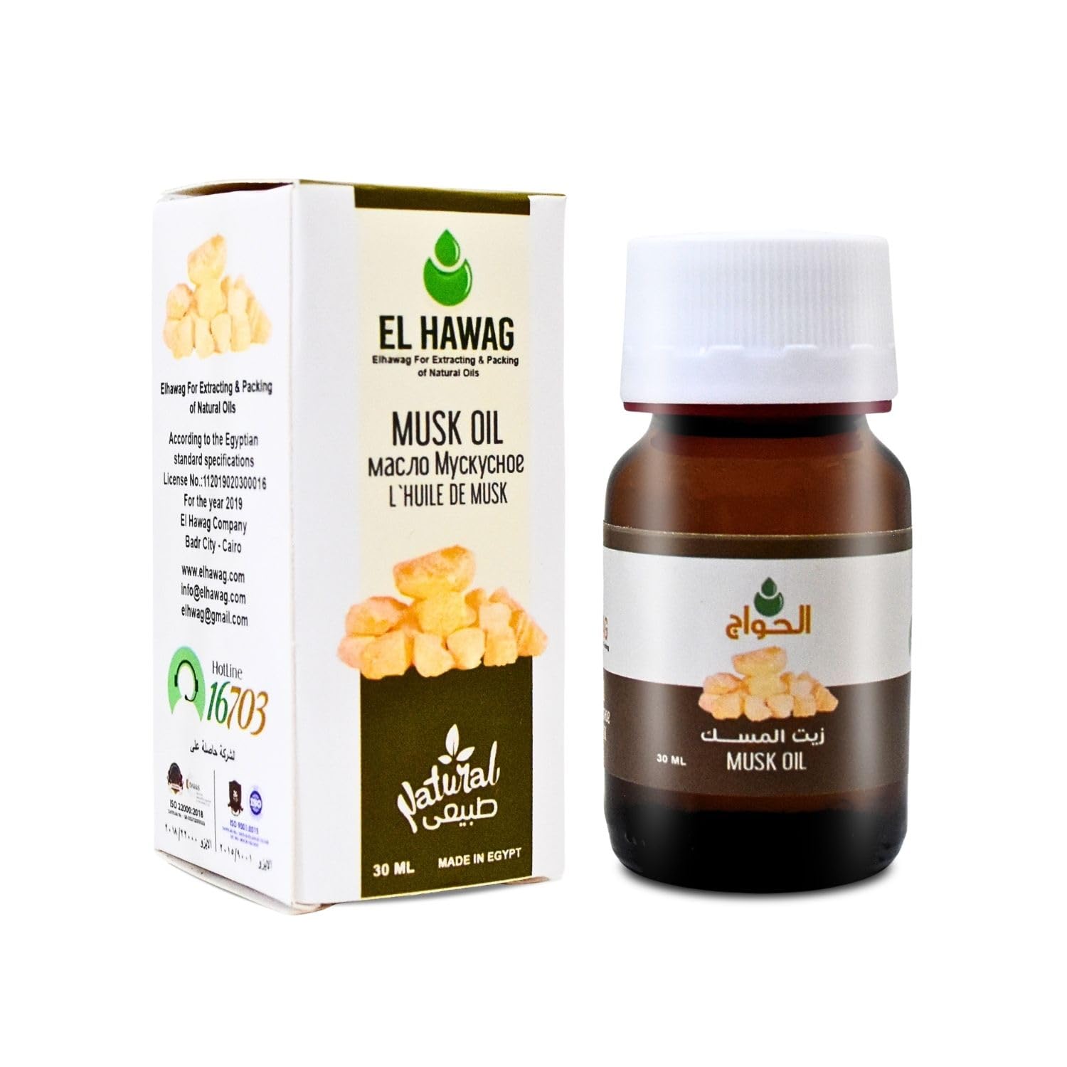 ✓ Item Description : Pure Natural Musk Oil Cold Pressed El Hawag Elhawag Natural Concentrated Crude Perfect Fresh For Skin No Additives Non Gmo Kosher Halal ( 1 Pack 1 oz 30 ml ) ? ? ✓ 100 Pure Oil Provides You With The Best Of Natural Great Ingredients Free From Artificial Colors Non Gmo No Caffeine No Additives Kosher Halal . ✓ Usage : Wash The Desired Area With Warm Water , Then Apply An Appropriate Amount To The Area And Move It Gently Until The Skin Absorbs It . ✓ The Musk Essential Oil Has A Powerful Properties And That Have Been Used For Beauty Care Purposes . ✓ Musk Oil Extraction : Steam Distillation ✓ a Pure Grade Essential Oil That Provides You With Nature's Finest Oils . ✓ Made In Egypt ✓ Weight (Approx.) : 1 Pack 1 oz 30 ml