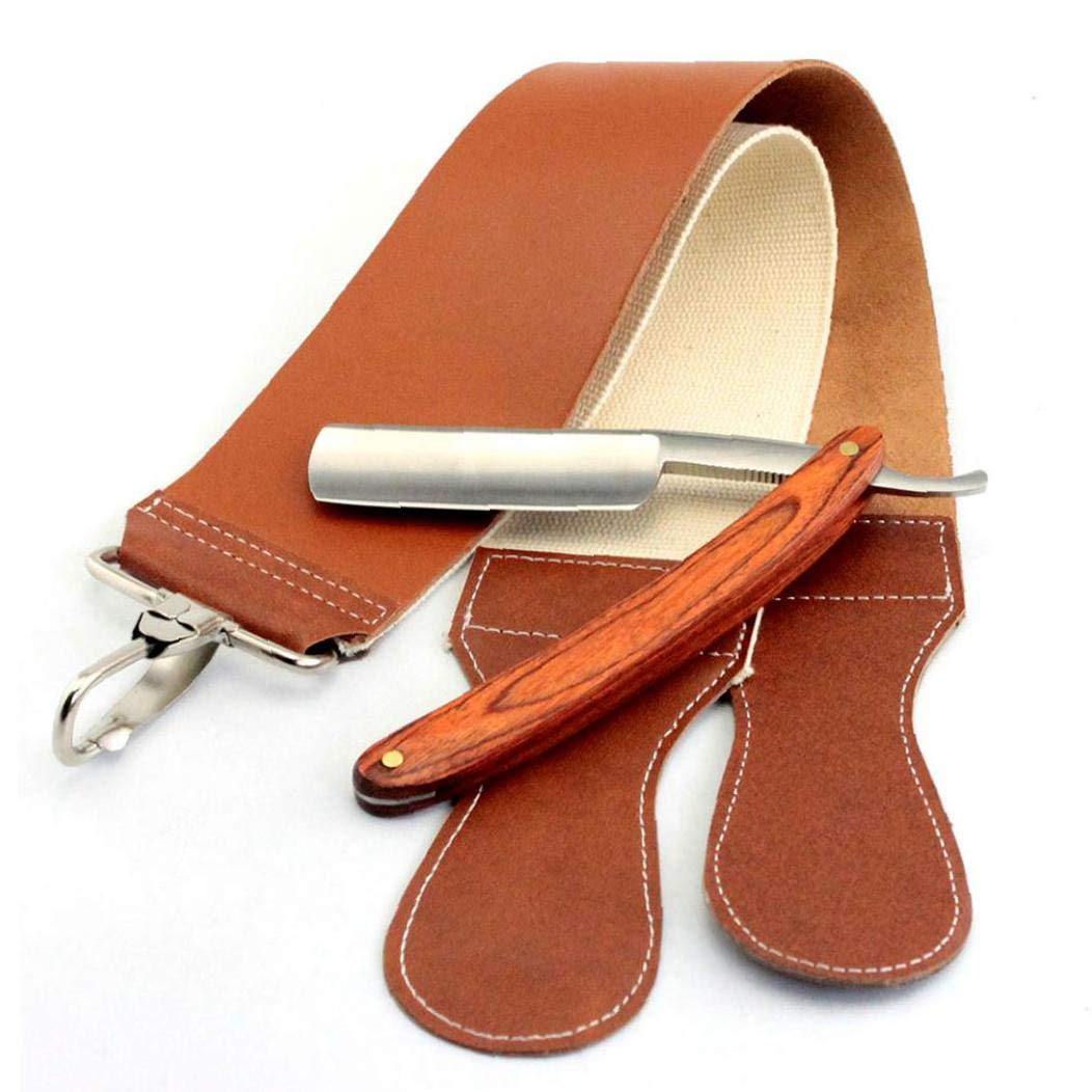 FEATURES: Â PREMIUM MATERIAL-the razor sharpening strap is made with best quality cowhide leather which allows for smoother shaving blades. CONVENIENT TO USE-hanging hook with lobster clasp is convenient to fix during use, which is suitable for professional or home use. DOUBLE SIDES DESIGN-one side is coarse and the other is fine. coarse and fine sides can meet your different needs. WIDELY APPLICATION-used for final sharpening and smoothing after honing razors.suitable for straight razors, sharpen knives and chisels. EASY SHAPING EXPERIENCE-the razor sharpening straps are finely balanced to allow for an easy sharpening experience. the strop has a handle at the bottom and swivel hanging tab on the top end for ease use. PACKAGE INCLUDING-1pc durable, soft and stylish leather razor strop. SPECIFICATION: Quantity:1pc. Weight:88g. Color:brown. Size:45X5cm/17.7x1.96inch. NOTE: Due to the light and screen setting difference,the item's color may be slightly difference from the pictures. Please allow slight dimension difference due to different manual measurement. Â Package Including 1pc*Leather Razor Strop
