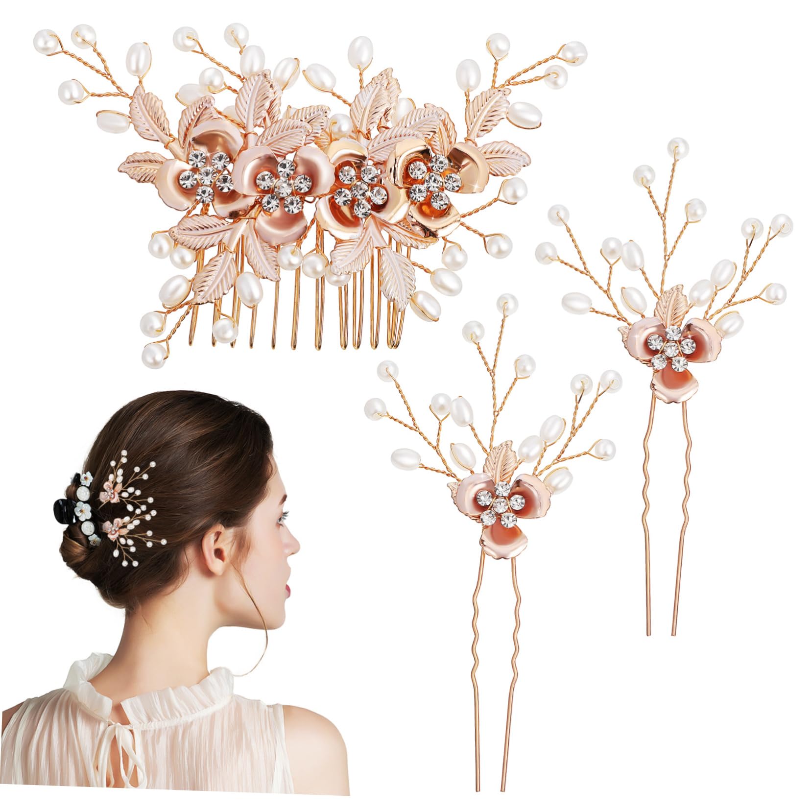 Rhinestone hair clips-- ??????pearl bride wedding hair comb pearl hair pins set gold bridal side comb u shape bridal hair clip wedding pearl hair combs set headpiece vintage bride hair accessories wedding for bridal. Hair combs for women-- [charming embellishment] the flower and pearl designs of these hair pins add a touch of charm and elegance to any hairstyle, making you more attractive and eye-catching. Hair accessories-- exquisite hair accessories: the hair clips feature a combination of flowers and leaves with pearl decorations, adding a touch of elegance to your hairstyle. Wedding hair side comb-- ??whether youre the bride or a bridesmaid, these hair side combs are designed to effortlessly complement any hair type or style. Hair jewelry-- [versatile styles] with three different pieces included in the package:a side comb and two hair pins. these hair accessories offer a variety of styles to suit different dressing needs, making them for weddings and parties.