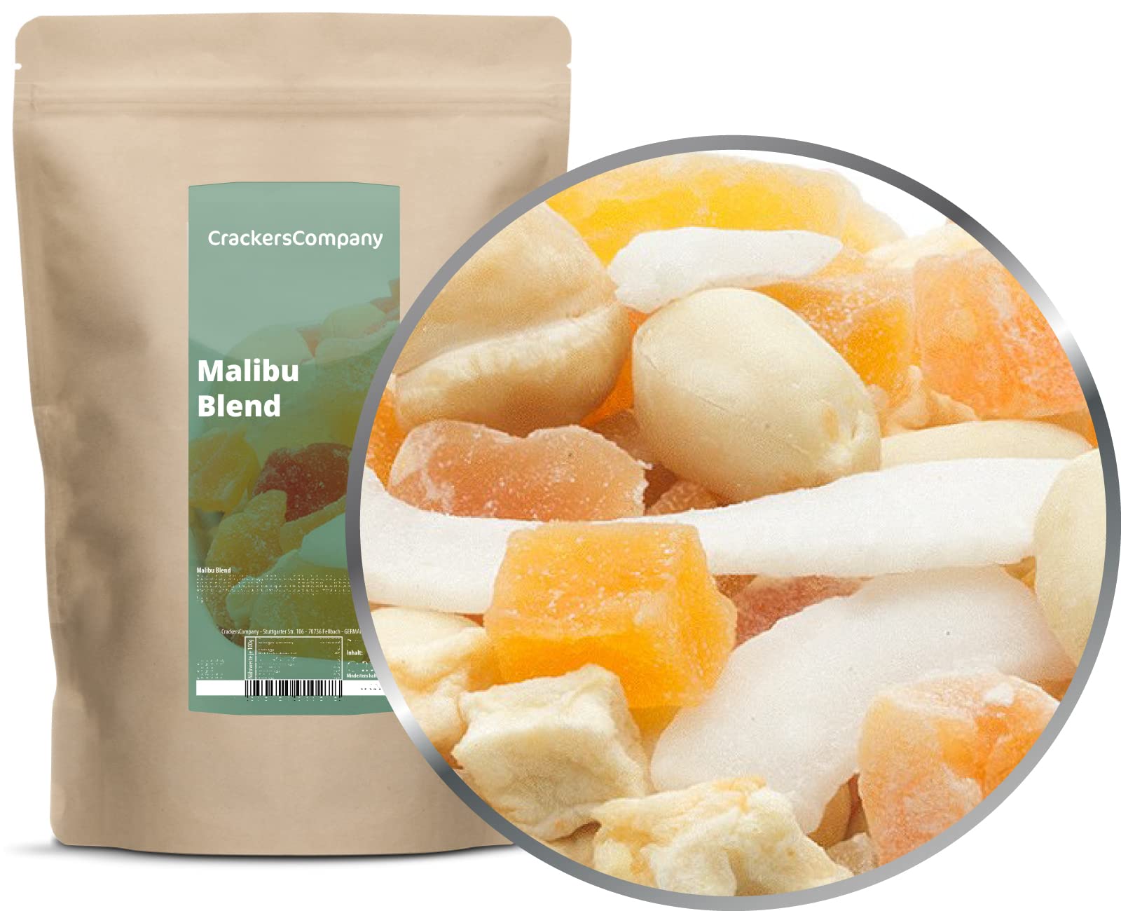 Like a day on the beach Like gently on the beach, white waves that give the blue Pacific its very special look on the coast of Malibus, the delicate coconut strips crown this mix of high -quality natural cashews, almonds and peanuts as well as candied pieces of pineapple, papaya and mango and dried apple pieces.This fantastically pastel-colored structure is reminiscent of the white sandy beach, embodied by the individual types of nuts, as well as the branches of apple and the fruits, with their red-orange yellow colors, reflect the rays of the setting sun in the sand once again.In terms of taste, an absolutely fantastic mix that works through its individual components like a wellness day on your senses. Fantasy trip to the Malibus beaches Our snow-white, candied coocon strips on a delicious sea of peanuts, almonds, cashew nuts, dried apple pieces, candied papaya and mango watches move like foam crowns.This mix, based on the white sandy beaches of Malibus, in the bay of Santa Monica, is simply pampered the senses with natural nuts and sophisticated pieces of candied exotic fruits.And with a little imagination you can imagine the sunset of the Californian sun on the beach of the ""Surf City of the USA"" when enjoying our Malibu mix in front of your inner eye and just smiling relaxed. Short vacation for the senses With our Malibu Mix, you succeed in a day on the beach in the California sun in no time and without having to put you on the plane.No expensive ticket or even a jet lag are necessary for this.Simply open a pack of our pastel -colored Malibu Mix and let a handful of the selected natural cashews, almonds and peanuts, decorated with candied pieces of pineapple, papaya and mango as well as stripes of coconut and dried apple pieces. Ingredients ingredients Cashwkerne, almond kernels, pineapple, pipe sugar, papaya, mango, coconut, acid regulator: citric acid, preservative: sulfur dioxide.Can contain traces of sulfites. Instructions Store cool, dry and protected by light. Address manufacturer importer CrackersCompany, Stuttgarter Straße 106, 70736 Fellbach, Germany More1 x 400 g in zip bag (400g).Wie ein Tag am Strand Wie sanft am Strand anlandende weiße Wellen, die dem blauen Pazifik seinen ganz besonderen Look an der Küste Malibus verleihen, krönen die zarten Kokosstreifen diesen Mix aus hochwertigen naturbelassenen Cashews, Mandeln und Erdnüssen sowie kandierten Stücken von Ananas, Papaya und Mango und gedörrten Apfelstückchen. Diese traumhaft pastellfarbige Gebilde erinnert an den weißen Sandstrand, verkörpert durch die einzelnen Nussorten, sowie die aparten Apfelstückchen und die Früchte, mit in ihren rot-orange-gelb Farbtönen, spiegeln die Strahlen der untergehenden Sonne im Sand einmalig wieder. Geschmacklich ein absolut traumhafter Mix, der durch seine einzelnen Komponenten wie ein Wellnesstag auf Deine Sinne wirkt. Phantasiereise an die Strände Malibus Wie Schaumkronen bewegen sich unsere schneeweißen, kandierten Kokosstreifen auf einem köstlichen Meer aus Erdnüssen, Mandeln, Cashewkernen, gedörrten Apfelstückchen, kandierten Papaya- und Mangowürfeln. Dieser, in Anlehnung auf die weißen Sandstrände Malibus, in der Bucht von Santa Monica, entstandene Mix, verwöhnt die Sinne mit naturbelassenen Nüssen und raffinierten Stücken kandierter exotischer Früchte einfach perfekt. Und mit etwas Phantasie kannst Du Dir beim Genuss unseres MALIBU MIX vor Deinem Inneren Auge den Sonnenuntergang der Kalifornische Sonne am Strand der ""Surf City der USA"" vorstellen und einfach nur entspannt lächeln. Kurzurlaub für die Sinne Mit unserem MALIBU MIX gelingt Dir ein Tag am Strand in der Kalifornischen Sonne im Handumdrehen und ohne Dich in den Flieger setzen zu müssen. Kein teures Ticket oder gar ein Jetlag sind dafür von Nöten. Öffne einfach eine Packung unseres pastellfarbenen MALIBU MIX und lass Dir eine Handvoll der ausgesuchten naturbelassenen Cashews, Mandeln und Erdnüsse, dekoriert mit kandierten Stücken von Ananas, Papaya und Mango sowie Streifen von Kokos und gedörrten Apfelstückchen in den Mund rieseln. INHALTSSTOFFE ZUTATEN CASHEWKERNE, MANDELKERNE, Ananas, Rohrzucker, Papaya, Mango, Kokos, Säureregulator: Zitronensäure, Konservierungsstoff: SCHWEFELDIOXID. Kann Spuren von SULFITEN enthalten. GEBRAUCHSANWEISUNG Kühl, trocken und lichtgeschützt lagern. ANSCHRIFT HERSTELLER IMPORTEUR CrackersCompany, Stuttgarter Straße 106, 70736 Fellbach, Deutschland Mehr1 x 400 g in ZIP Beutel (400g).1 x 400g Exotische Studentenfutter Nusskernmischung mit Cashew Mandel Ananas Papaya Mango Kokos salzfrei vegetarisch vegan glutenfrei laktosefrei Mango 1 x 400 g in ZIP Beutel (400g)