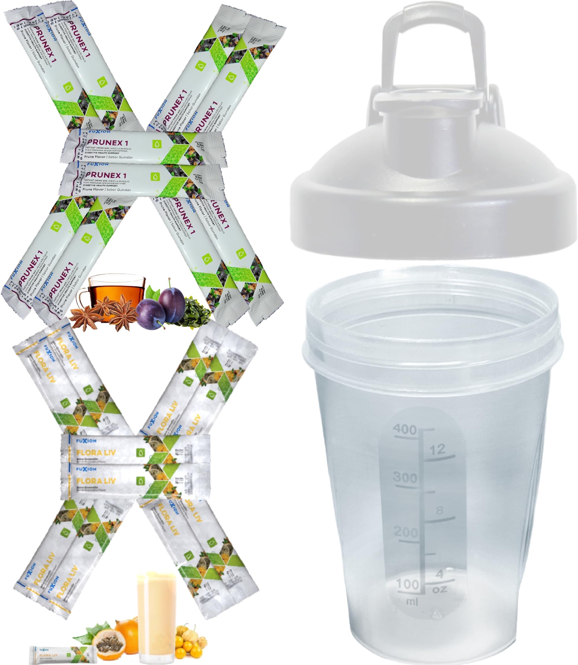 10-Day Trial Pack for Colon Cleanse & Defense - Drink Prunex 1 Before Sleep Drink Flora Liv After Breakfast 5000mg per Stick of Each Plus Small Ergonomic Clear Shaker 12oz w. Mixer Ball & White Lid