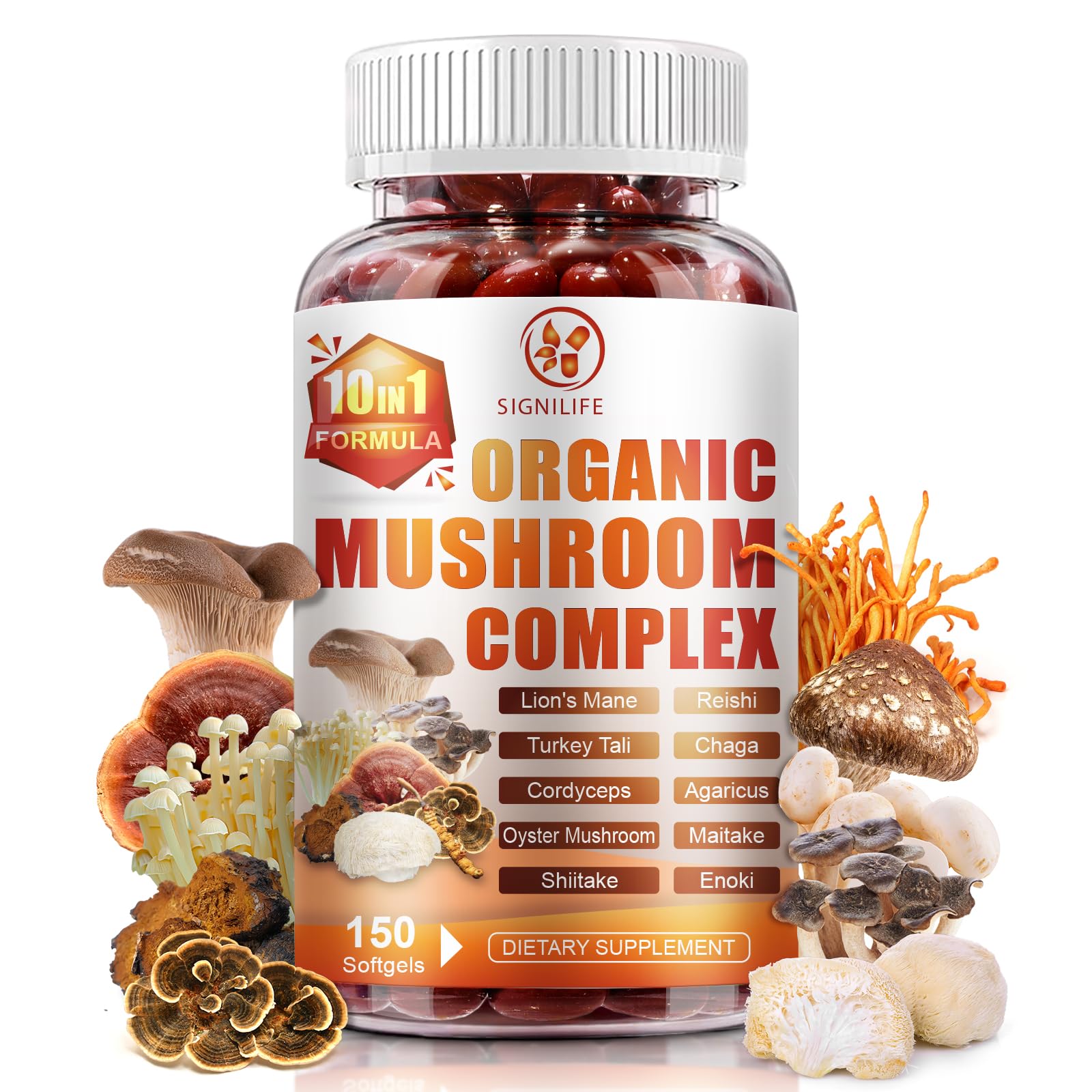 Total Wellness in Every Softgel More than just a Lion's Mane supplement, this 10-in-1 formula supports brain health, immune function, antioxidant protection, and natural energy. An ideal choice for anyone looking to boost daily performance and long-term vitality with trusted mushroom softgels. Clean, Pure Non-GMO Formula Crafted without GMOs, gluten, soy, dairy, or artificial preservatives. Our mushroom supplement uses only clean, natural ingredients — with no unnecessary fillers, additives, or hidden extras. Just simple, plant-based wellness you can trust every day. High Potency Extracts Fast Absorption Made with 10:1 mushroom extracts for superior potency-each dose equals thousands of milligrams of raw mushroom powder. Easy-to-swallow softgels are designed for optimal absorption. Take just 2 softgels a day — each bottle provides a full 75-day supply (150 softgels total). Brain Support for Memory Focus Rich in Lion's Mane Mushroom Extract (300mg), this supplement is designed to promote focus, memory retention, and mental clarity. It's your daily go-to brain supplement for memory and focus, whether for work, study, or staying mentally sharp as you age. 10 Powerful Mushrooms in One Formula Each softgel contains a potent blend of 10 functional mushrooms: Lion's Mane, Turkey Tail, Reishi, Cordyceps, Chaga, Maitake, Agaricus, Shiitake, Enoki, and Oyster Mushroom. These mushrooms work synergistically to support overall wellness, immune defense, and natural vitality.