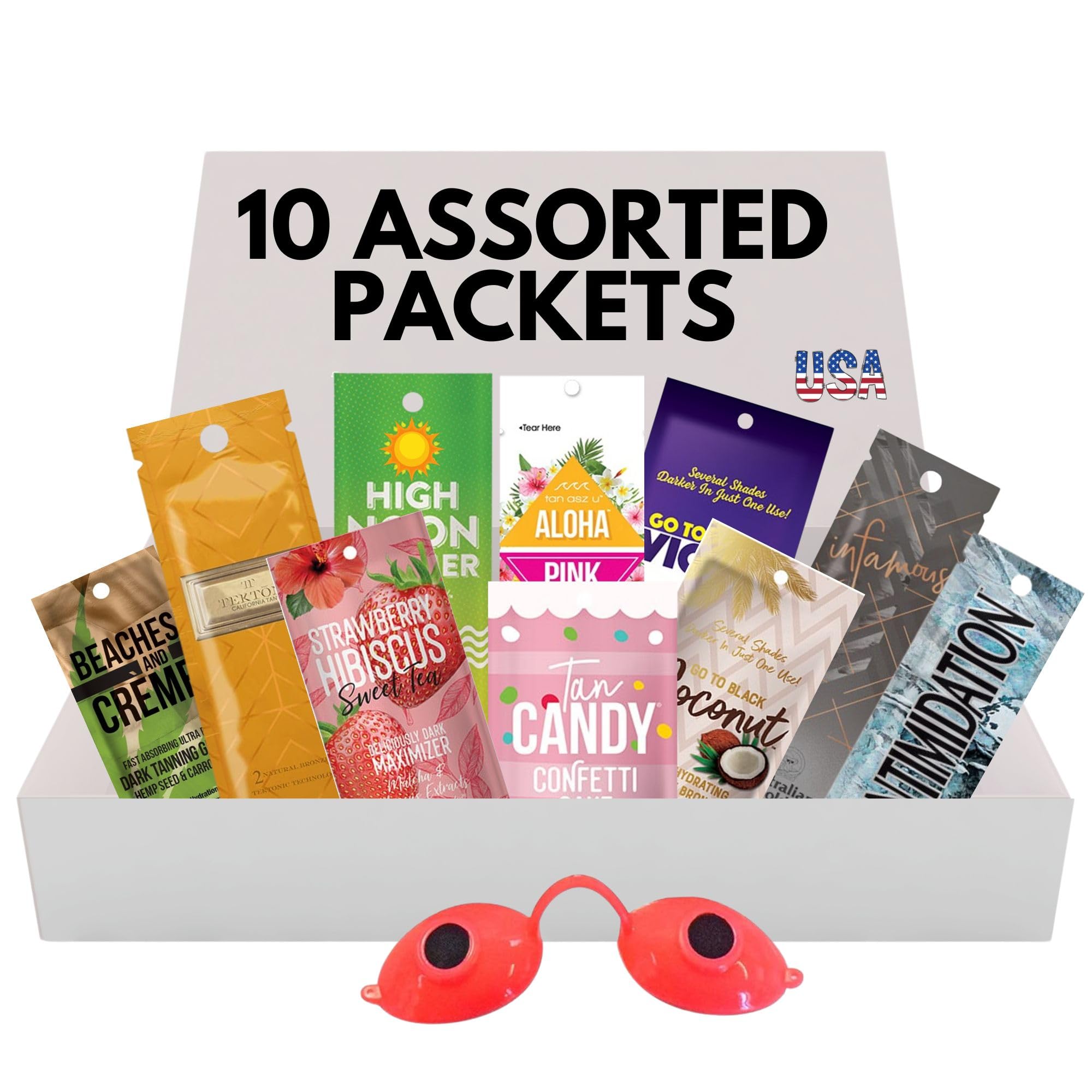 Perfect for All Tanning Needs: Whether you love the sun's natural rays or prefer the control of indoor tanning beds, this tanning box has you covered! Each lotion is designed to boost your tan with bronzers, tan accelerators, with skin-nourishing ingredients that lock in moisture and color. Maximize Your Tan: Our 10 Pack of Tanning bed lotion, includes bronzing lotions for quick color, tanning accelerators to speed up your natural tan, tan maximizers to deepen extend your glow. Tanning Eyewear Included (Random Selection) -- Keep your eyes safe while you tan! Sanitary eyewear is a must for protecting your eyes from tanning bed light ensuring a hygienic, flawless tanning experience. 10 Assorted Variety Tanning Lotion Packets (0.5 fl oz or higher each) ---- Includes popular tanning brands for indoor tanning beds and outdoor tanning. A surprise treasure trove of various tanning bed lotions for indoor and outdoor tanning!.