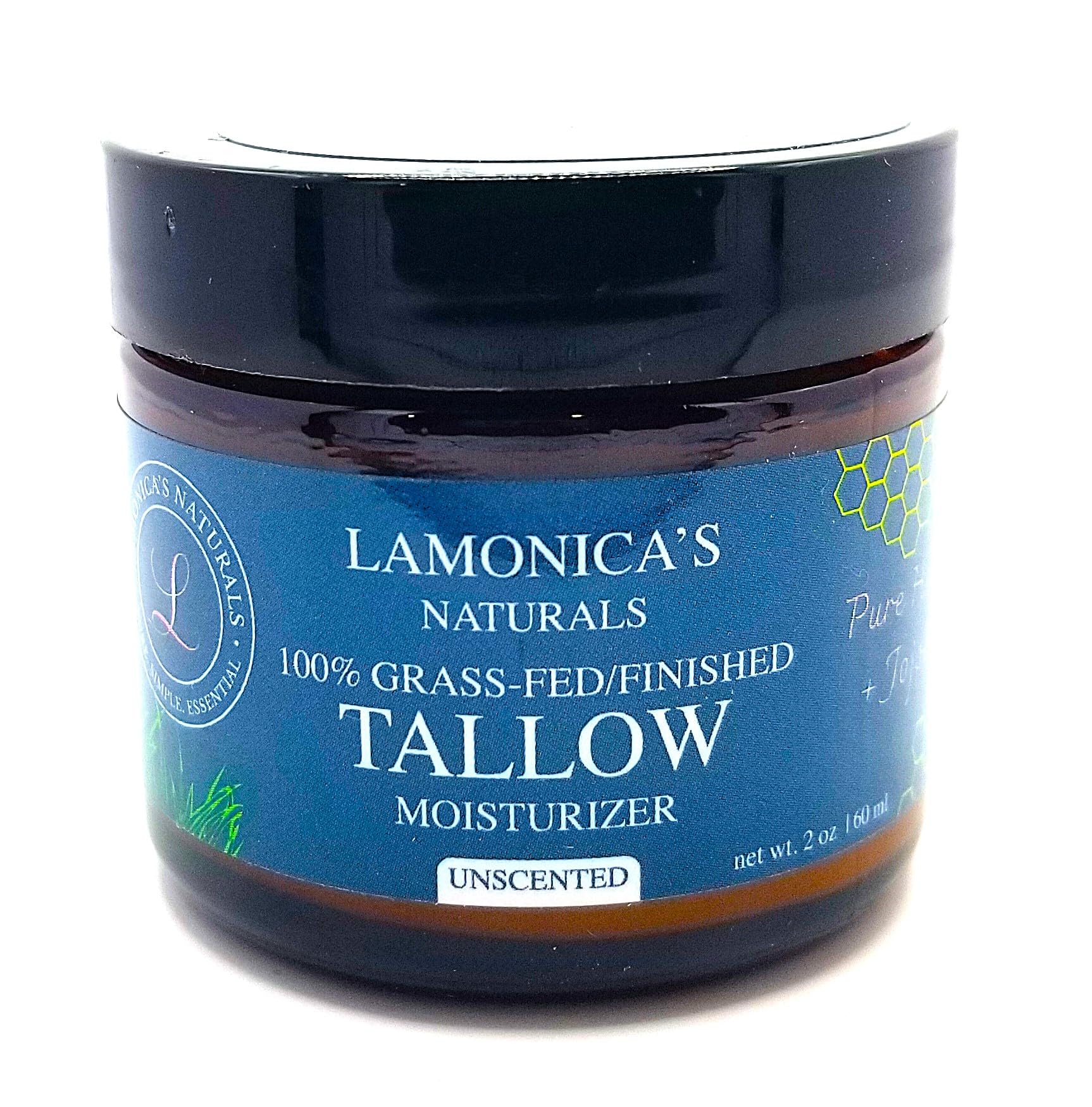 The rich, nourishing formula harnesses the ancestral traditional benefits of tallow, a time-tested ingredient known for its skin-nurturing properties. Tired of skincare full of promises but no performance? Meet Lamonica's Naturals Unscented Whipped Tallow Moisturizer — the simplest, most effective skin treatment on the market. This powerhouse balm is made with just three ingredients your skin actually recognizes: 100 grass-fed finished beef tallow, organic jojoba oil, and organic honey. Why it works? Tallow is molecularly similar to your skin's own oils, making it ultra-absorbent and vitamin rich. We add organic jojoba to lock in moisture without clogging pores, and raw honey to soothe and heal.MOISTURIZING FORMULA: Rich tallow based formula deeply hydrates and nourishes skin with traditional, time-tested ingredients. VETERAN-OWNED: Proudly distributed by a veteran and first responder-owned business committed to quality skincare products. Manufactured in a FDA Registered and GMP Certified facility in the USA! 2-ounce (60 ml) amber glass jar provides ample product while protecting the natural ingredients from light exposure. UNSCENTED: For All Skin Types – Unscented, non-comedogenic, gender-neutral. Perfect for dry, damaged, sensitive, or eczema-prone skin. For a soothing experience for sensitive skin. SKIN BARRIER ARMOR – Restores and protects skin with vitamins A, D, E, and K. Naturally rich in healthy fats for a deep healing tallow moisturizer. NATURAL INGREDIENTS: 100 Grass-Fed and Finished tallow moisturizer crafted with pure, Organic Honey, Organic Jojoba Oil, Natural ingredients for skin nourishment. UNSCENTED NO BEESWAX Experience the natural goodness of Lamonica's Naturals Tallow Moisturizer, a Veteran-Owned and RN Co-Founded husband and wife duo skincare company. Crafted from 100 Grass-fed and finished beef tallow. This UNSCENTED moisturizer is perfect for daily skincare routines. We did the R D so you don't have to! NO BEESWAX, no sticky feeling, only smooth GLIDE! Ethically sourced Lightly whipped to blend ingredients, No deflation like others! Thick creamy dense, and smooth.