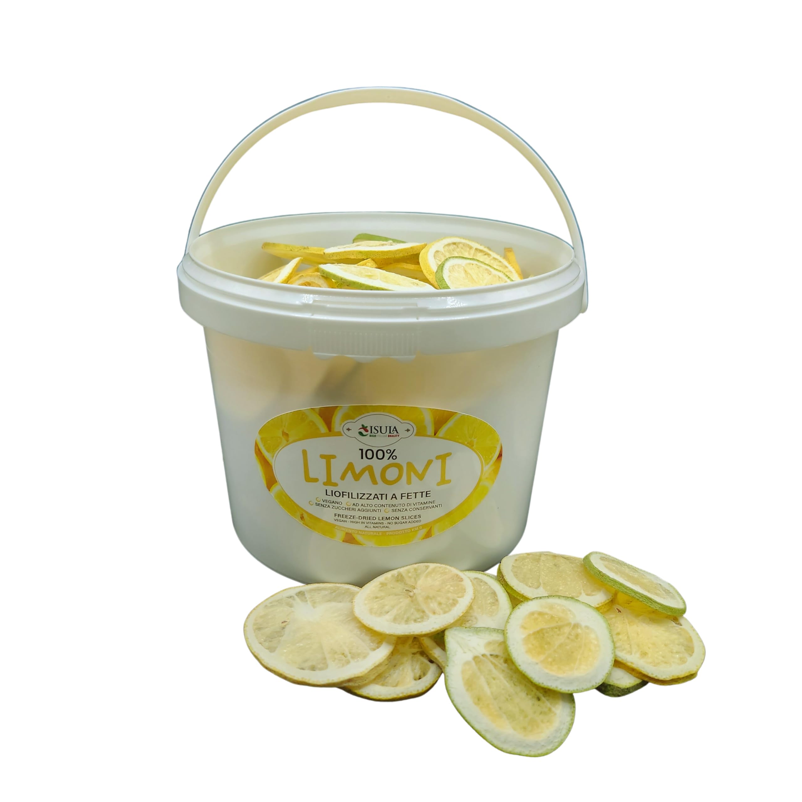FREEZE-DRIED LEMONS: Our freeze-dried lemons are the perfect solution to always have the vibrant flavor of freshly picked lemons on hand. Through the freeze-drying process, we preserve the freshness and intensity of the lemons, guaranteeing an authentic flavor and a crisp texture. With our freeze-dried lemon slices, you can enrich your drinks, desserts, savory dishes, and much more. IMMEDIATE REHYDRATION: Contact with water will be enough to completely rehydrate the lemons, allowing them to release their unique aromas and flavors. PACKAGING DEDICATED TO BARS AND RESTAURANTS: This extra-large 3-liter container, designed and certified for food use, is the ideal choice for those looking for maximum convenience and versatility. Inside, you will find approximately 130 high-quality freeze-dried lemon slices, ready to be used to add a touch of freshness and professionalism to your cocktails or gourmet dishes. and much more. NATURAL AND NO ADDED SUGAR: Our philosophy is based on the goodness of the fruit itself. We do not add sugar or artificial sweeteners to alter the natural flavor of the fruit. 100 ITALIAN FRUIT: Our selection of freeze-dried snacks is based exclusively on the highest quality Italian fruit. In addition to producing on our own farm, we collaborate with local farmers who produce fresh, healthy, and delicious fruit. Our attention to quality begins at the harvesting stage, ensuring that only the best products are used. PROFESSIONAL COCKTAILS AND DRINKS: Improve your bartending skills to the highest level with our freeze-dried sliced lemons! Add a subtle note of freshness and an unrivaled touch of professionalism to your cocktails. Surprise and conquer your customers with elegant and refined decorations, which will transform each drink into a unique and unforgettable experience.CITRONS LYOPHILISÉS : Nos citrons lyophilisés sont la solution parfaite pour toujours avoir à portée de main la saveur vibrante des citrons fraîchement cueillis. Grâce au processus de lyophilisation, nous préservons la fraîcheur et l'intensité des citrons, garantissant une saveur authentique et une texture croquante. Avec nos tranches de citron lyophilisées, vous pourrez enrichir vos boissons, desserts, plats salés et bien plus encore. RÉHYDRATATION IMMÉDIATE : Le contact avec l'eau suffira à réhydrater complètement les citrons, leur permettant de libérer leurs arômes et saveurs uniques. EMBALLAGE DÉDIÉ AUX BARS ET RESTAURANTS : Ce récipient extra large de 3 litres conçu et certifié pour un usage alimentaire est le choix idéal pour ceux qui recherchent un maximum de commodité et de polyvalence. A l'intérieur, vous trouverez environ 130 tranches de citrons lyophilisés de haute qualité, prêtes à être utilisées pour ajouter une touche de fraîcheur et de professionnalisme à vos cocktails ou plats gourmands. et beaucoup plus. NATUREL ET SANS SUCRE AJOUTÉ : Notre philosophie est basée sur la bonté du fruit lui-même. Nous n'ajoutons pas de sucre ni d'édulcorants artificiels pour altérer la saveur naturelle du fruit. 100 FRUITS ITALIENS : Notre sélection de snacks lyophilisés est basée exclusivement sur des fruits italiens de la plus haute qualité. En plus de produire sur notre propre ferme, nous collaborons avec des agriculteurs locaux qui produisent des fruits frais, sains et délicieux. Notre attention à la qualité commence dès la phase de récolte, en veillant à ce que seuls les meilleurs produits soient utilisés. COCKTAILS ET BOISSONS PROFESSIONNELS : Améliorez votre professionnalisme de barman au plus haut niveau avec nos citrons tranchés lyophilisés ! Ajoutez une subtile note de fraîcheur et une touche de professionnalisme sans égal à vos cocktails. Surprenez et conquérez vos clients avec des décorations élégantes et raffinées, qui transformeront chaque boisson en une expérience unique et inoubliable.