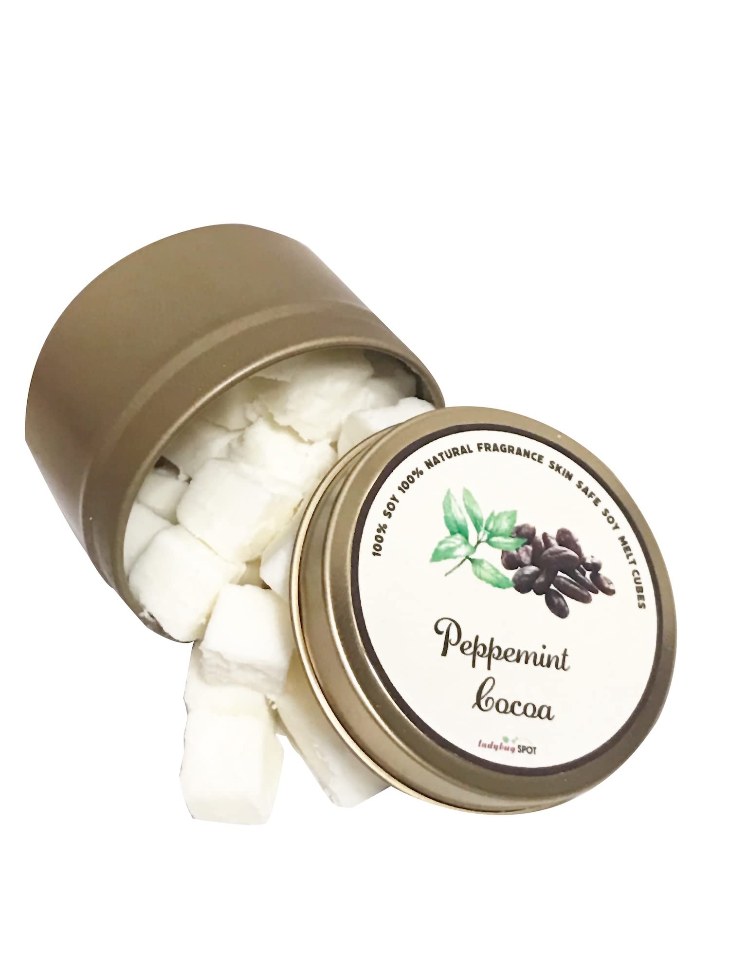 100% Soy & 100% Natural Fragrance Skin Safe Soy Wax Melt Cubes in Travel Size Gold Tin Jar 3.5 OZ (Pepppermint & Cocoa)
