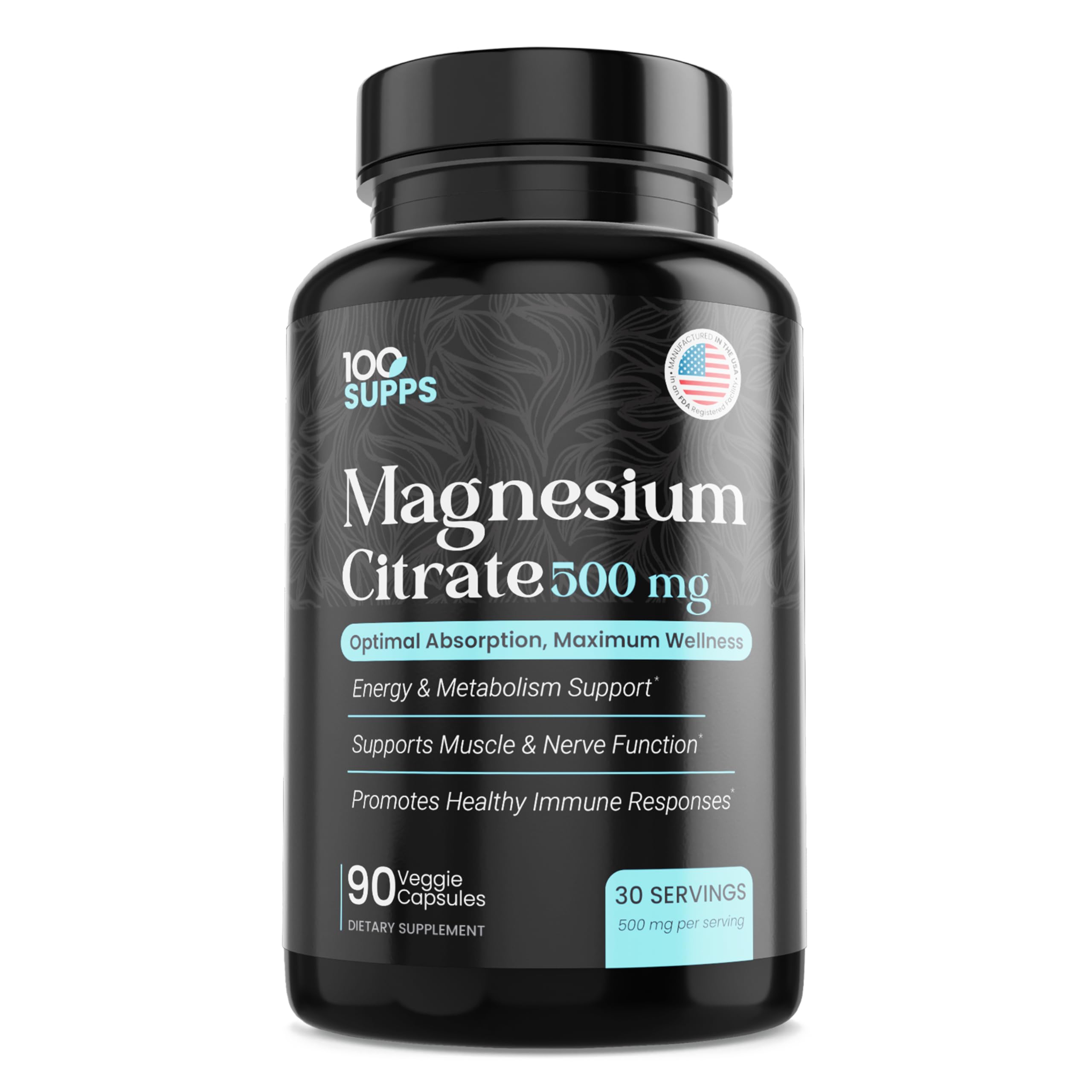 100 Supps Magnesium Citrate 500mg 90 Capsules | 30-Day Supply | High Absorption Magnesium for Muscle Nerve & Energy Support | Vegan Gluten-Free Non-GMO | Made in USA