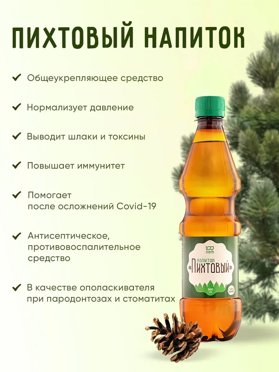 Пихтовый напиток "100 лет" - это натуральный экстракт пихты, созданный для укрепления здоровья всей семьи. Этот сибирский напиток, упакованный в удобную 500 мл бутылку, поможет вам справиться с простудой, гриппом и ОРВИ. Натуральный состав, богатый полезными веществами, благотворно влияет на печень и желудок. Пихтовый напиток "100 лет" - отличный выбор для поддержания иммунитета в холодное время года. Также имеет названи абисиб . Придает организму поистенне Сибирское здоровье.