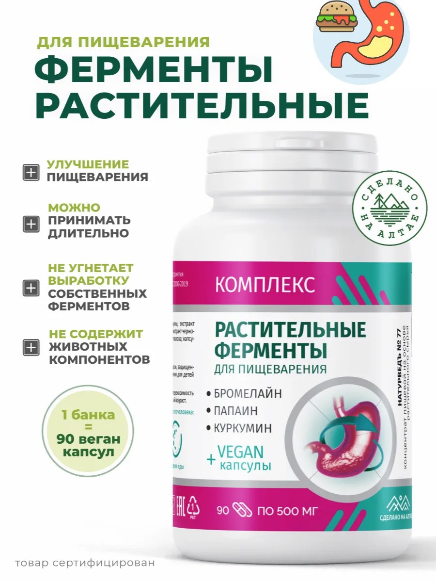 A complex of plant components and enzymes benefits the digestive system. Namely, Apple Fiber: This is a soluble fiber that helps improve digestion, promotes gut health, increases feelings of fullness, and may lower cholesterol. Turmeric Extract (Curcumin): Curcumin has powerful anti-inflammatory and antioxidant properties, helps improve digestion, and supports liver health. Pineapple Extract (Bromelain): Bromelain is an enzyme that helps break down proteins, supports proper digestion, and reduces inflammation in the gastrointestinal tract. Papaya Extract (Papain): Papain, like bromelain, promotes protein breakdown, improves digestion, and may relieve symptoms of stomach heaviness. Artichoke Extract: Known for its properties to support liver health, promote the elimination of excess fat, and stimulate the production of bile, which improves the digestion of fats. Black Pepper Extract (Piperine): Piperine improves the bioavailability of other nutrients and active ingredients, and also has antioxidant and anti-inflammatory properties. Microcrystalline Cellulose (MCC): Used as a bulking agent, it can also act as a form of insoluble fiber, promoting regularity and improving bowel health. Overall, this complex can significantly support and improve digestion, aid in the breakdown of complex food components, and promote overall well-being and digestive health. Not a dietary supplement or a medicine. Made in Altai.