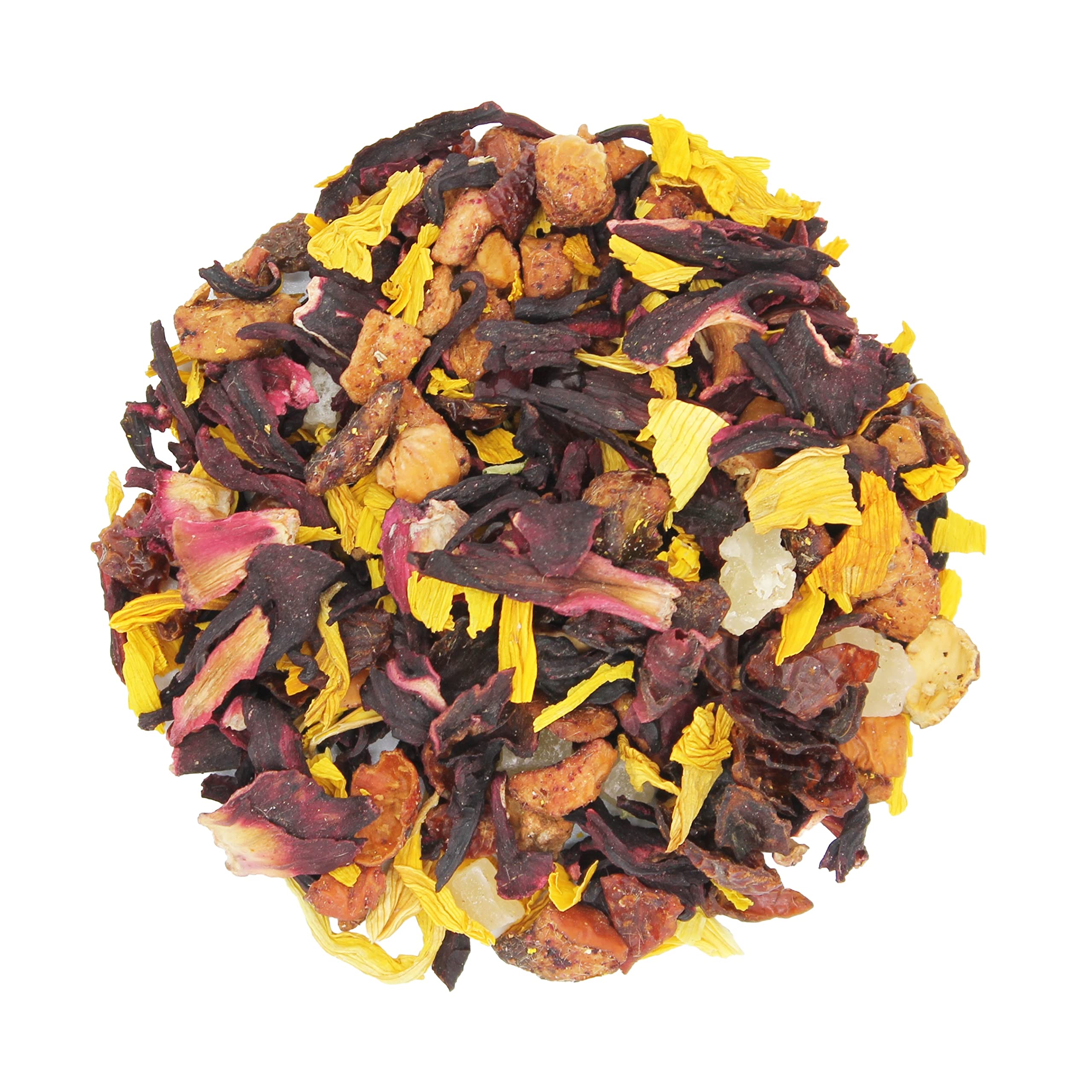Pineapple Apple Fruit Tea. Unflavored fruit tea. A fruity tea blend that impresses with its very natural fruit taste. Tea preparation: Pour one to two tablespoons into a cup (250 ml) of boiling water and let it steep for at least 5 to 10 minutes. Let it steep. Sweeten with a little honey or sugar. A premium fruit tea blend: with plenty of fruit pieces, no added flavorings, no added salt, vegan. Ingredients: rosehip peels, hibiscus flowers, 20 apple, 16 pineapple (pineapple, sugar, citric acid), sunflower flowers. Allergy advice: May contain traces of mustard, celery, sesame, gluten, and almonds. Storage: Store in a cool, dry place away from light. Keywords: pineapple fruit tea - fruit tea blend - tea - tea mix. INGREDIENTS Rosehip, hibiscus flowers, 20 apple, 16 pineapple (pineapple, sugar, citric acid), sunflower flowers. Allergens: May contain traces of mustard, celery, sesame, gluten, and almonds!1000Kräuter Thé aux fruits Mélange de thé de fruits Thé Fruits Thé (pomme-anananas)DESCRIPTION DU PRODUIT DESCRIPTION DU PRODUIT Thé aux fruits ananas pomme. Thé aux fruits non aromatisé. Un mélange de thé fruité qui convainc par un goût de fruits très naturel. Préparation du thé : verser une à deux cuillères à soupe sur une tasse (250 ml) avec de l'eau bouillante et au moins 5 à 10 minutes. Laisser tirer. Sucrer avec un peu de miel ou de sucre. Un mélange de thé aux fruits de qualité supérieure : avec de nombreux morceaux de fruits, sans arômes ajoutés, sans sel ajouté, végétalien. Ingrédients : écorces de cynorhodon, fleurs d'hibiscus, 20 de pomme, 16 d'ananas (ananas, sucre, acide citrique), fleurs de tournesol. Conseils pour les allergies : peut contenir des traces de moutarde, de céleri, de sésame, de gluten et d'amandes. Stockage : frais, sec et à l'abri de la lumière. Mots-clés : thé aux fruits et aux ananas - mélange de thé aux fruits - thé - mélange de thé. INGRÉDIENTS Églantier, fleurs d'hibiscus, 20 de pomme, 16 d'ananas (ananas, sucre, acide citrique), fleurs de tournesol. Allergènes: Peut contenir des traces de moutarde, de céleri, de sésame, de gluten et d'amandes!