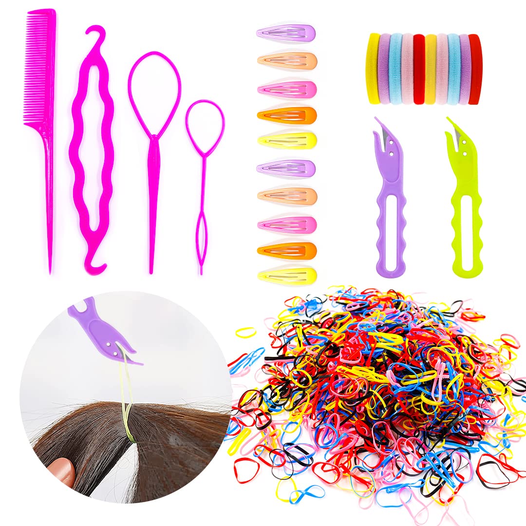 1000Pcs Elastic Hair Bands 2Pcs Rubber Hair Band Remover Cutter 2Pcs Topsy Tail Hair Tool Kit 10Pcs Hair Clips 10Pcs Hair Ties for Toddler Baby Girls Pain Free Ponytail Remover Tool Hair Styling Set