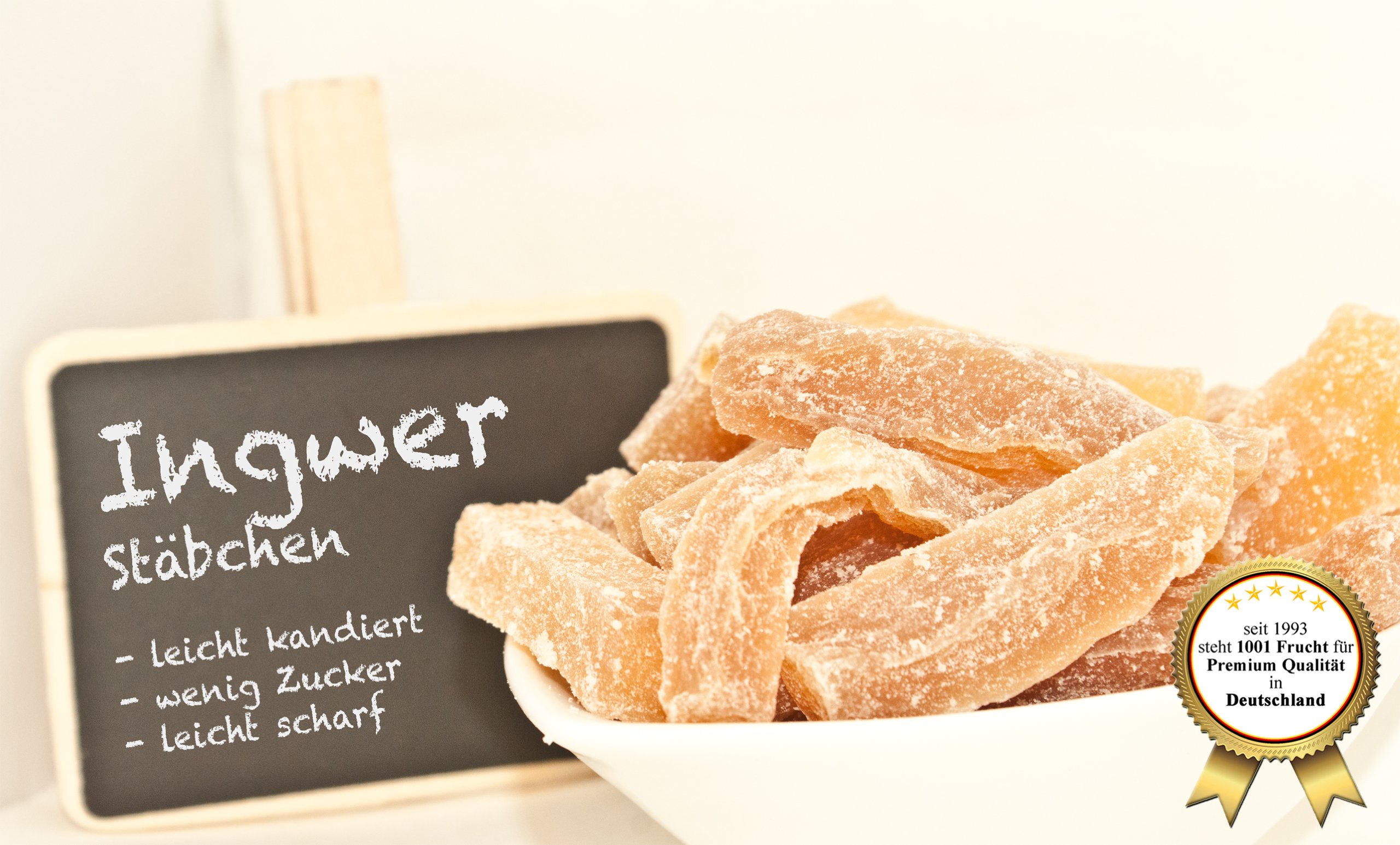 1001 FRUCHT will als kleines Familienunternehmen mehr Menschen für einen nachhaltigen Konsum begeistern und von der hohen Qualität fair gehandelter und unbehandelt hergestellter Produkte überzeugen. GEPRÜFTE QUALITÄT - Unsere Produkte entsprechen den strengen deutschen Qualitätsstandards. Ohne Farbstoffe, ohne Glutamat Geschmacksverstärker, ohne Konservierungsstoffe, ohne künstliches Aroma. GESUNDE NASCHEREI für zwischendurch zum Knabbern oder als gesunde Süßigkeiten statt kalorienhaltiger Nachspeise. Die leichte Schärfe des Ingwer ist eine gesundheitsbewußte Alternative zu Süßem. BELEBENDES FRUCHTAROMA - typisch Thailand bringt leicht kandierter Ingwer scharf intensiven Geschmack in jede Küche und verfeinert Speisen durch sein süß-scharfes Aroma und ist zudem noch gesund. WERTVOLLER SNACK oder fruchtig gesunder Müslizusatz mit Vitamin C Magnesium Eisen Zingiberol Diarylheptanoiden ätherischen Ölen. Ingwer ist im Winter und in der asiatischen Heilkunde sehr beliebt.