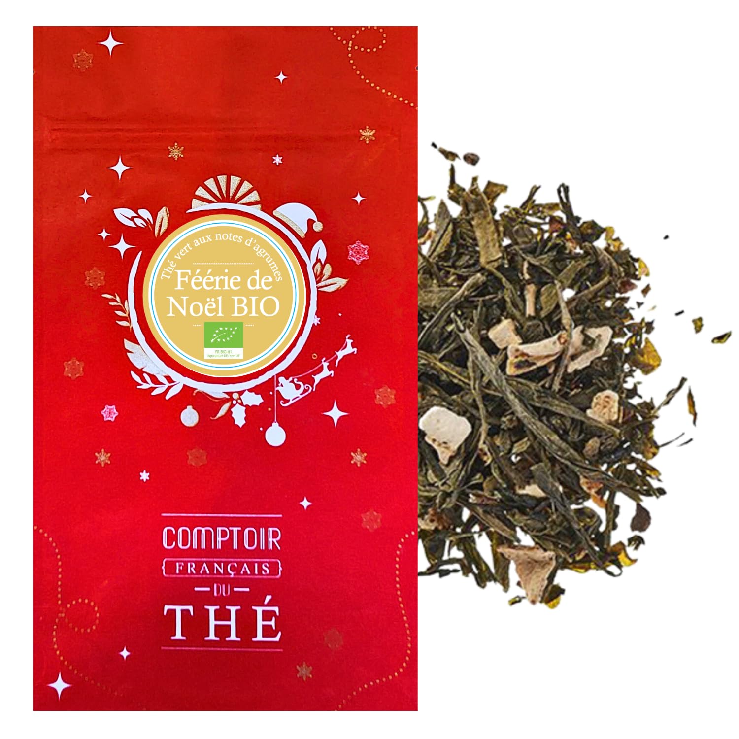 [SPICY FLAVORS] Each cup is distinguished by a subtle blend of spices that perfectly complements the citrus notes, offering a rich and memorable finish. ? [QUICK BREWING] A quick and easy delight to prepare with just 4 minutes of brewing at 75 C, ideal for a revitalizing break between holiday preparations. [ORGANIC GREEN TEA] Savor the pure and authentic taste of this organic Sencha green tea, a natural source of well-being and festive joy. BAG: 100 grams of loose leaf tea ˜ 40 Cups Zip closure for better preservation of your favorite tea. [CITRUS VITALITY] "Organic Christmas Magic" offers a vibrant harmony of orange and mandarin, awakening the senses to the magic and vibrancy of the holidays.[SAVEURS ÉPICÉES] Chaque tasse se distingue par un mélange subtil d'épices qui complète parfaitement les notes d'agrumes, offrant une finition riche et mémorable. ? [INFUSION RAPIDE] Un délice rapide et simple à préparer avec seulement 4 minutes d'infusion à 75 C, idéal pour une pause revigorante entre les préparations des fêtes. [THÉ VERT BIO] Savourez le goût pur et authentique de ce thé vert Sencha biologique, une source naturelle de bien-être et de joie festive. SACHET : 100 grammes de thé vrac ˜ 40 Tasses Fermeture avec Zip pour une meilleure conservation de votre thé préféré. [VITALITÉ AGRUMÉE] "Féérie de Noël BIO" offre une éclatante harmonie d'orange et de mandarine, éveillant les sens à la magie et la vivacité des fêtes.100g de Thé Vert en vrac aux notes d'Orange et de Mandarine Féérie de Noël - COMPTOIR FRANÇAIS DU THÉ