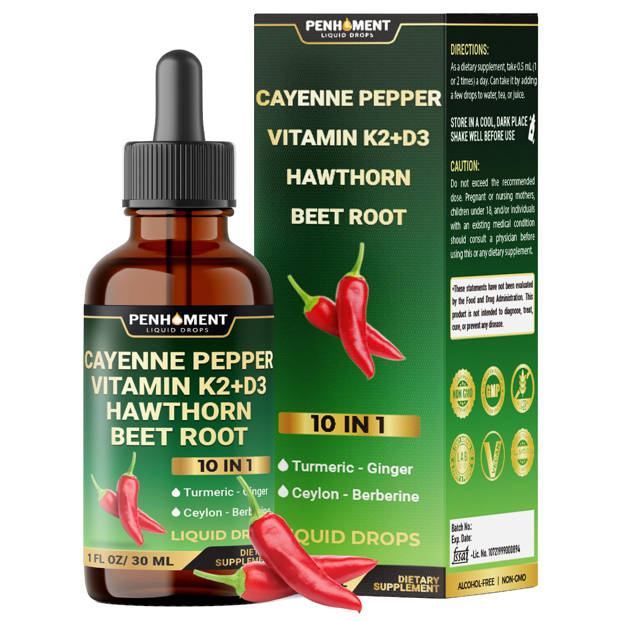 10in1 2700mg Cayenne Pepper Liquid Drops + Hawthorn Berry, Vitamin D3 K2 Beet Root Turmeric Ginger and More - Digestion Support - 1 Fl Oz - 2 Months Supply 1 Fl Oz (Pack of 1)