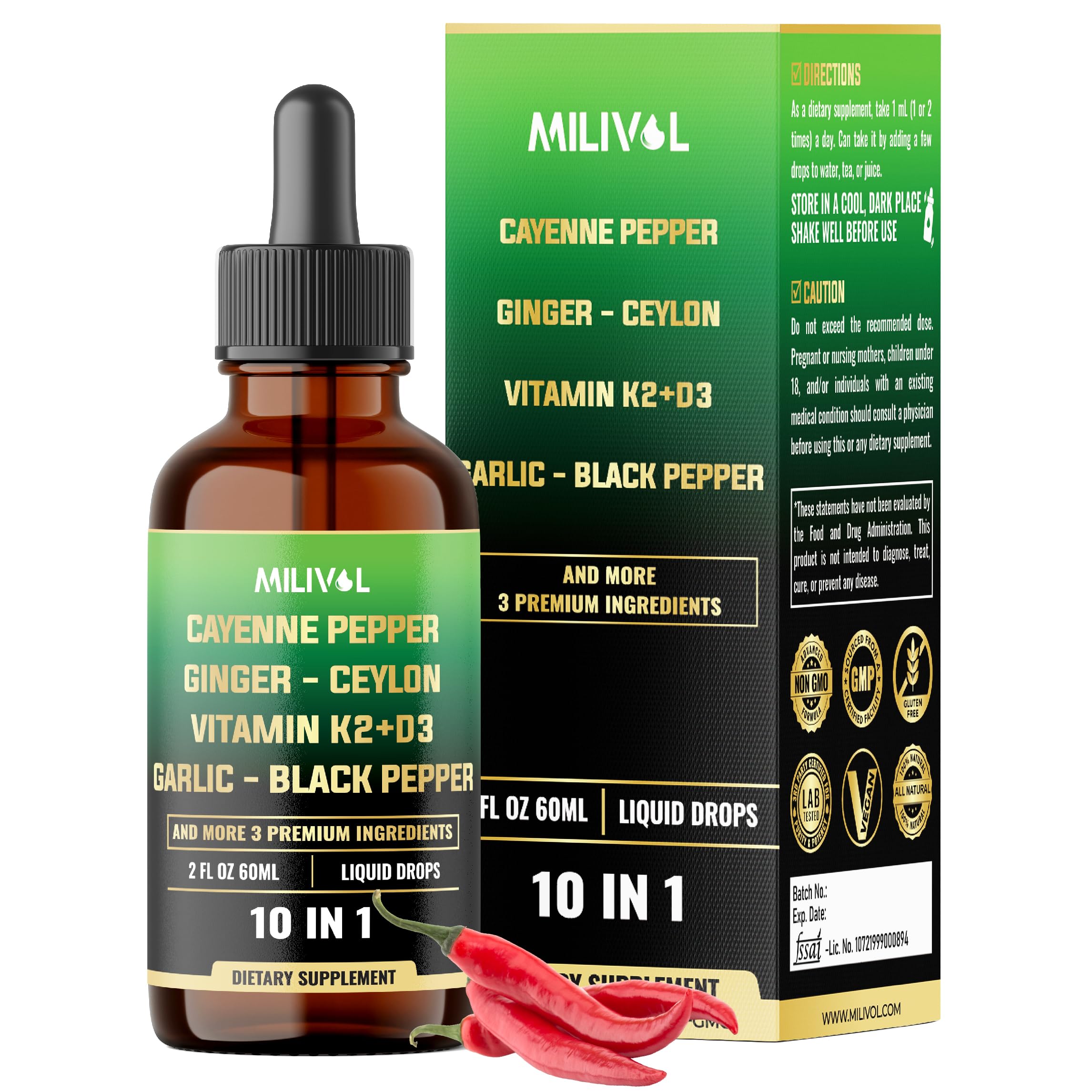 ✓ Guaranteed Satisfaction: Support your health and wellness journey. When you choose our Liquid Cayenne Pepper Drops, you're choosing a product backed by rigorous quality standards and a commitment to excellence. ✓ Commit to Quality: Milivol is dedicated to sourcing the finest ingredients to create trusted supplements. Every batch is non-GMO and third-party tested for quality, purity, and potency, ensuring they meet the highest standards. ✓ Simple Daily Use: Take Cayenne Pepper Supplement 1ml per day. Each 60ml bottle provides a 2-month supply, making it easy to incorporate into your routine. ✓ Health Benefits: Designed Cayenne Pepper Extract Drops to support joint mobility, immune defense, sustained energy levels, and heart function. ✓ Powerful Formula: A blend Cayenne Pepper Tincture of Vitamin D3, Vitamin K2, Cayenne Pepper, Ginger, Ceylon Cinnamon, Garlic, Black Pepper, Turmeric, Berberine, and Holy Basil for targeted wellness support.