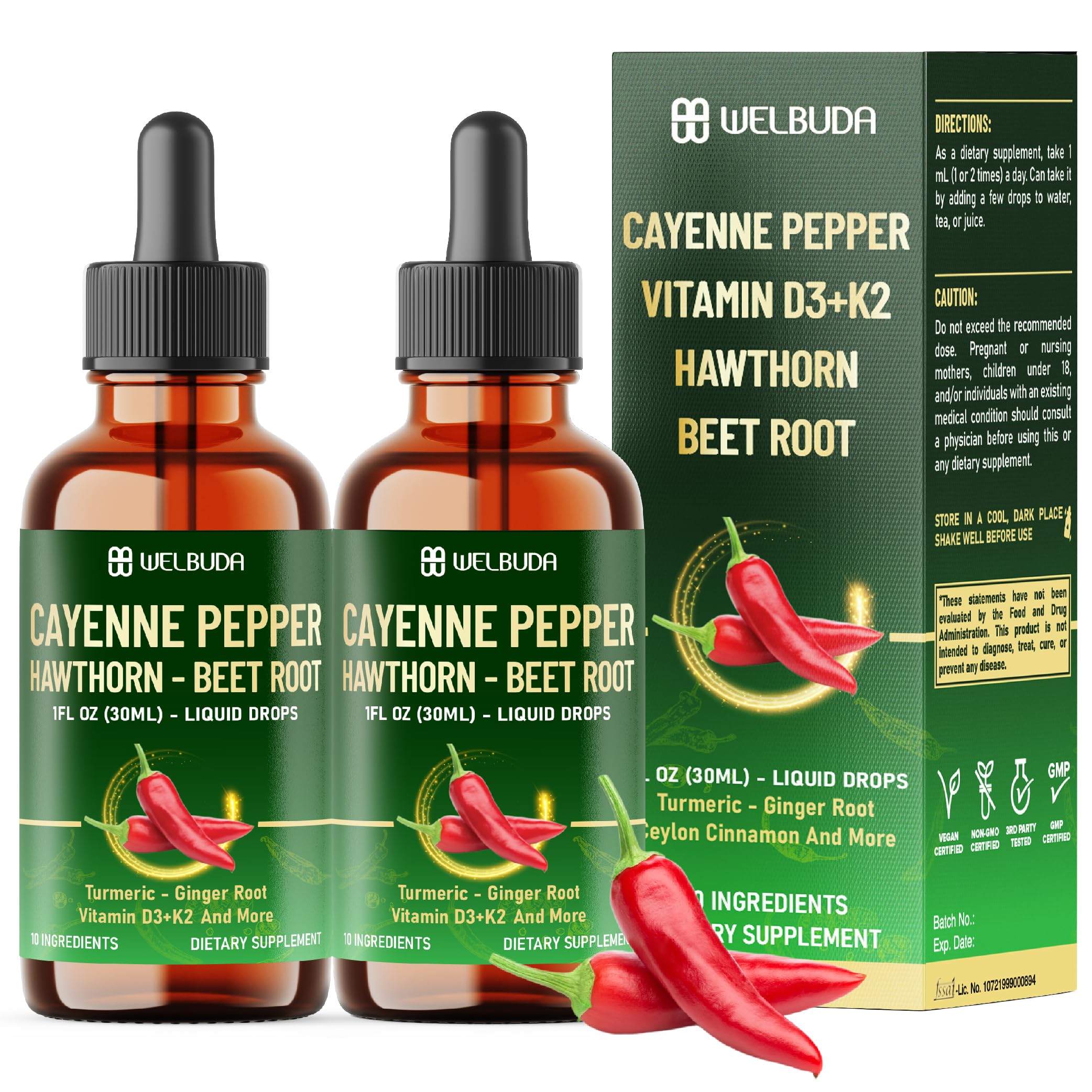 10in1 Cayenne Pepper Supplement with Hawthorn Berry Beet Root Turmeric Ginger Ceylon Cinnamon Berberine Panax Ginseng 2 Pack (60ml Total) - 60Days Supply