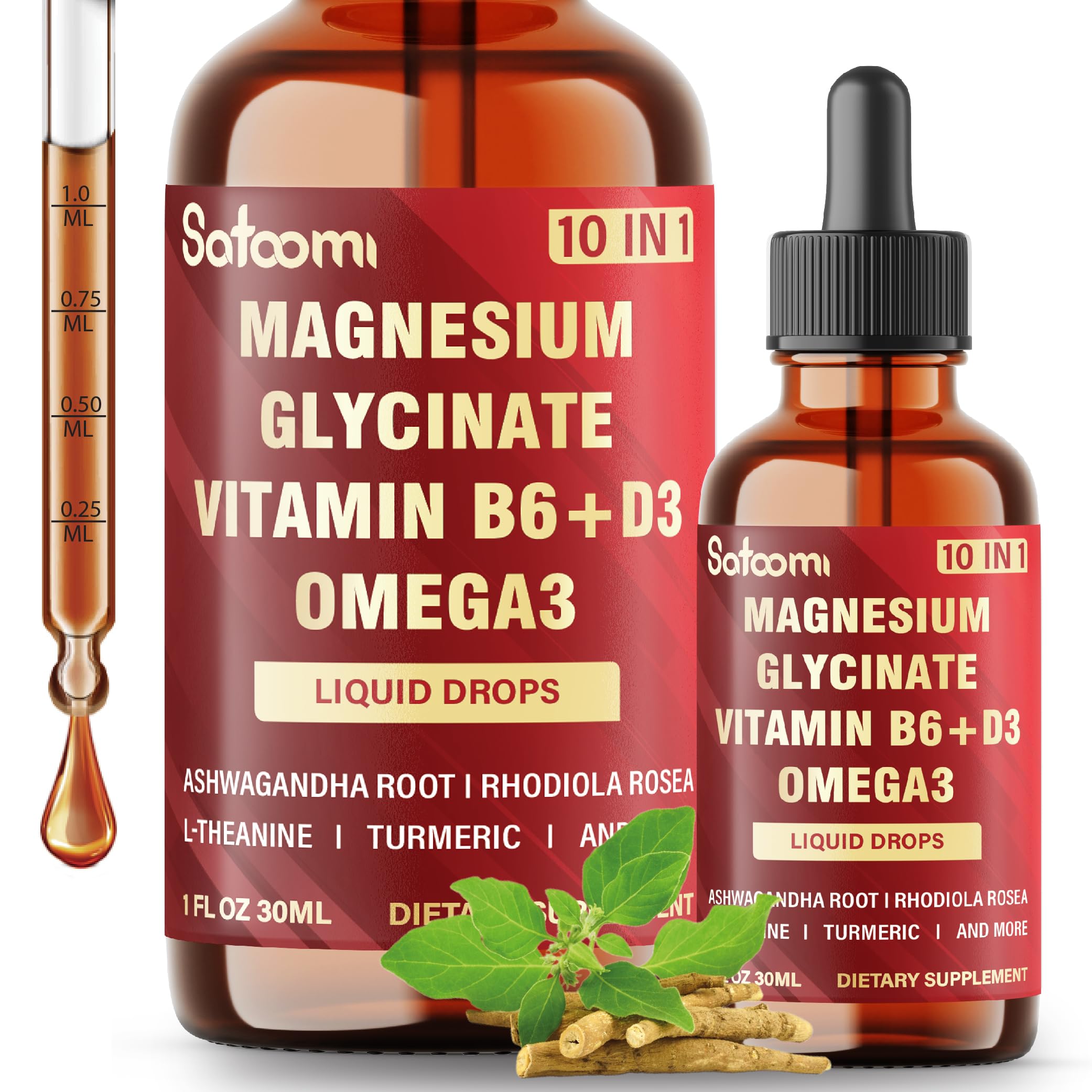 10in1 Magnesium Glycinate Liquid Drops Magnesium Complex Supplement with Omega3 Vitamin D3 Vitamin B6 Ashwagandha and More - Supports Overall Wellness - 1 FL Oz - 1 Month Supply