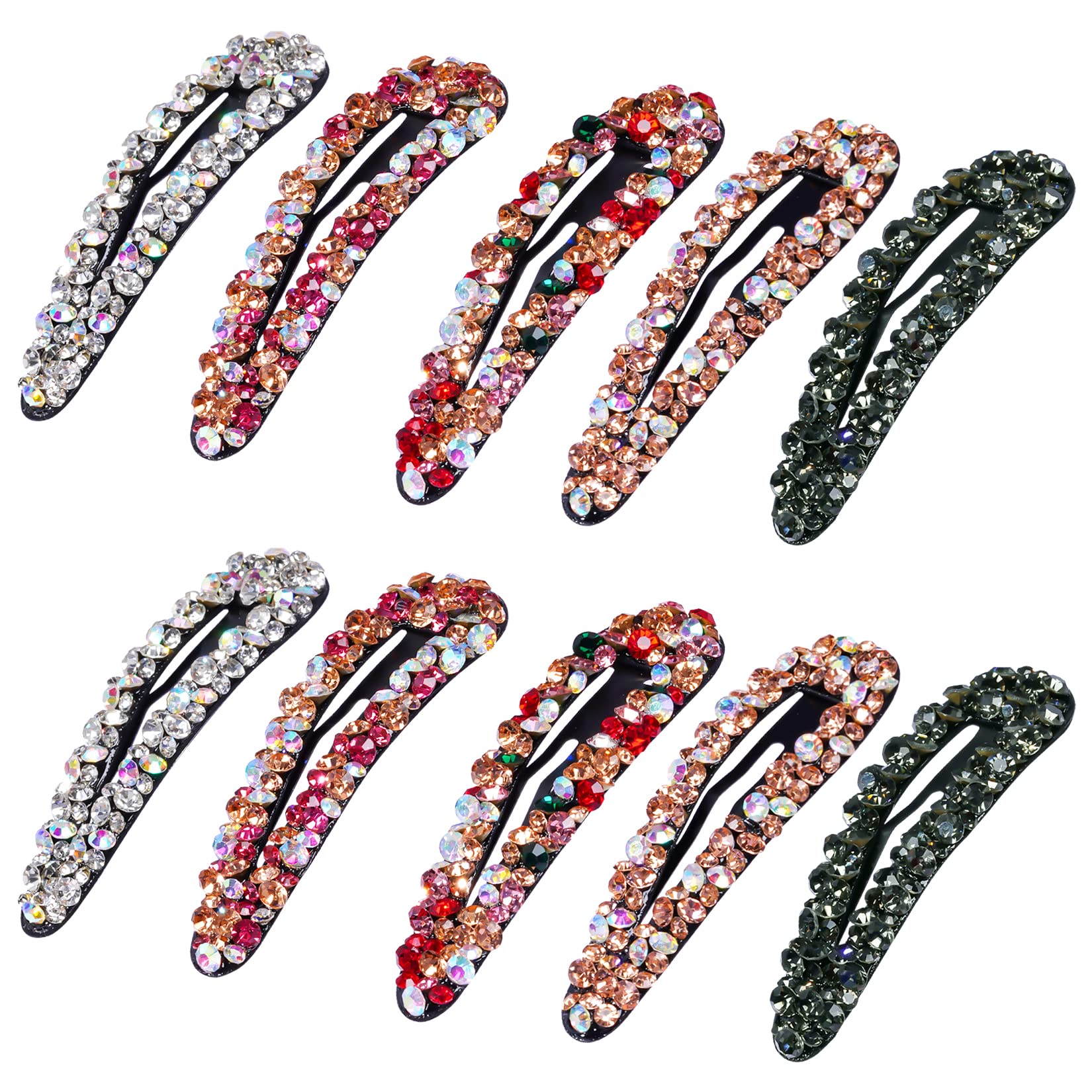 Widely used These metal buckles are suitable for many occasions. They can be worn in everyday wear, but also in other parties and holidays. You can also give these clips as gifts to your sisters and friends, they will love them. asy to use he hair accessories have a smooth surface and can be easily removed without pain or struggle. It can be matched with different hairstyles, such as straight or curly hair. The hair accessories have very good performance and can be used for a long time. Quality material The Crystal Hair clip is about 8 cm/3.5 inches. Each metal snap hairpin is made of high-quality metal, and the clip is black painted to prevent the hairpin from rusting. The inlaid shiny small rhinestones, which are firmly attached on the surface, will not fall off randomly. Special design Our fashion large hair barrettes adopts an arc design, which can be better inserted into the hair before wearing, and can better fit the hairstyle after wearing. Each clip ruler is polished, it will not harm your hair and scalp. Each fashion large hair barrettes adorned with selected rhinestone crystals,different colors from different angles, very shiny. Package includes The package includes 10 black crystal hairpins. A sufficient number of crystal clips can meet your requirements, including, white, champagne, pink, black, mixed colors, a total of five colors.
