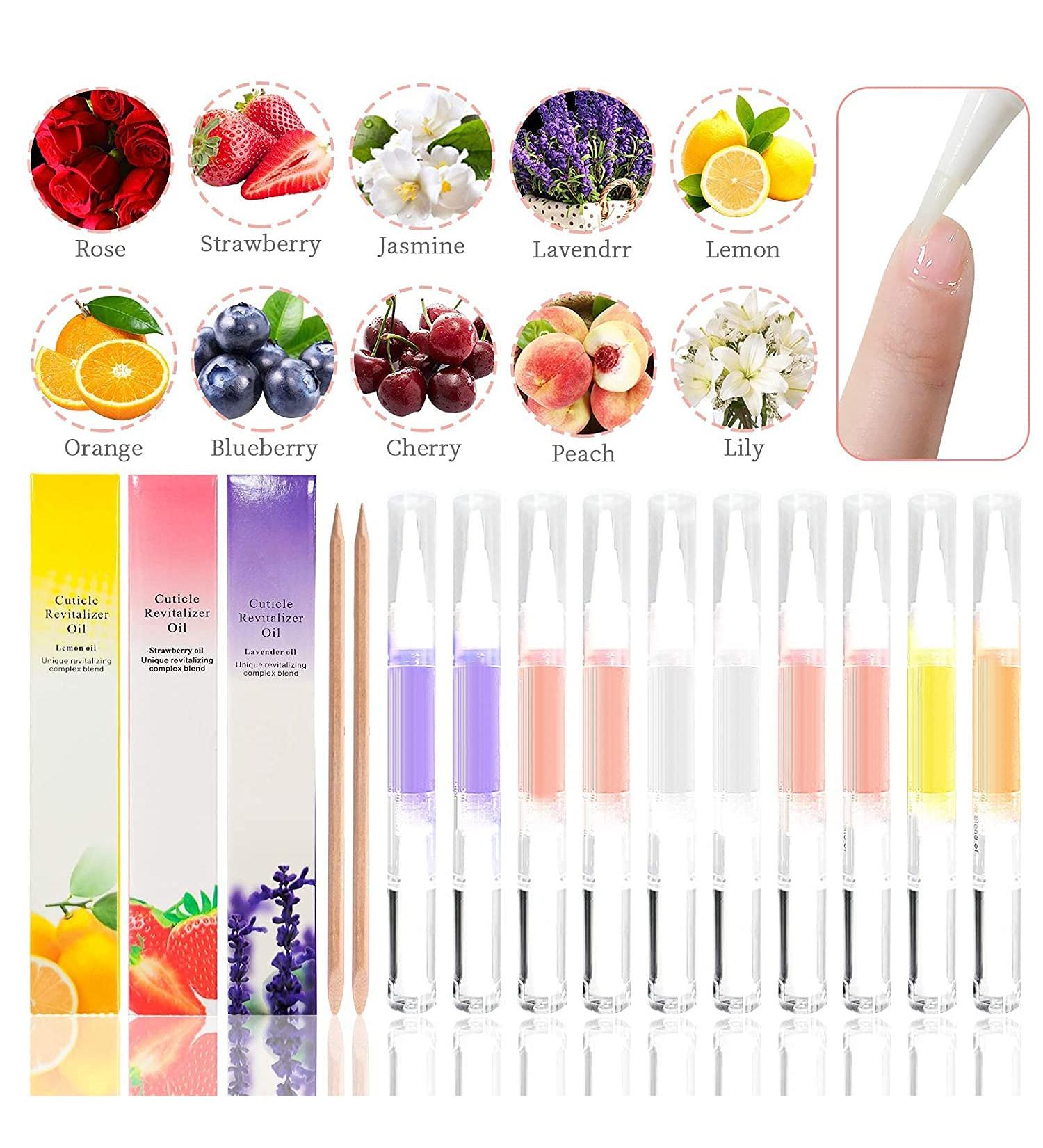 HOW IT WORKS : Fingernails are a composite of keratin cells and the perfect balance of about 18 percent moisture (water) and about 5 percent body oil. Nails that have inadequate moisture split and fracture like the dry earth. Water, nail polish removers, and soap wash away your finger body oil, which over time weakens the nail plate and causes all kinds of damage. Replenishing the layers of your nails with cuticle pen is an excellent way to replace your body oil. When you use Oil Pen regularly, you'll get nails that bend instead of break so they will grow long, strong and beautiful. MORE FEATURES : Repairs peeling, brittle nails in 3 days, eliminates hangnails within 5 days, and decreases skin wrinkling Main ingredients is Palm oil, easy to assimilated Keep you away from cracking of nail polish, gel, and acrylic nail enhancements Convenient brush pen applicator. Take it on the go, in your purse or in your car MARK : Rush a tiny amount of oil all over your nail, cuticle, sidewalls and under the free edge of your nail. You only need a thin layer of oil so they feel slightly slippery. There is no need to look "all greased up." You only need 1 or 2 clicks of oil per nail. When you feel the oil has been absorbed and your nails aren't slippery, your nails are ready for you to reapply more oil. You might need 5 to 10 applications the first day , After it two or three times as a day. GIFT IDEA: The Cuticle Oil Set is a perfect gifts for women, mom, sister, daughter, girls, friends, teens. Perfect gift idea for daily life and festivals, such as Birthday, Mother's Day, Valentine's Day, Easter Day, Thanksgiving, Christmas, Xmas, New Year, etc. THIS CUTICLE OIL PEN SET IS suitable to apply on gel polish nails, UV gel nails, acrylic nails, false nails, natural nails, etc. Suitable for professional nail salons, nail art schools, and DIY home personal use. HIGH QUALITY: The cuticle oil are made for natural ingredients extracted from plants, is rich in fruity ingredients, fragrant, non-toxic, moisturizes and nourishes cuticles while encouraging healthy nail growth, de-aging skin for the impatient. Sharmless to your nails, give nails enough nourishment. PERFECT FUNCATION:The cuticle oil can softens and inhibits dead skin growth, protects your hands from barbs, reduce epidermal wrinkles, and promote healthy nail growth. Makes your hands smooth, delicate and shiny. 15/10 CUTICLE OIL PEN SET: This Cuticle oil pens bulk is perfect for nail care, it is helpful for nail nourishment and keeping nails healthy, and can be prevent the formation of agnail. This Nail Cuticle Oil Pen set included15/10 kinds of taste: Rose, strawberry, jasmine, lavender, lemon,Orange, blueberry, cherry, peach, lily,/Pineapple, Aloe, Watermelon, Osmanthus, Apple.GTIN: 745437807562. Best Sellers Rank: See Top 100 in Beauty & Personal Care. Unit Count: 1.00 Count. Active Ingredients: Jasmine,lavender,lemon,watermelon. Item Form: Gel. Scent: Lavender,Lemon,Orange,Pineapple. Brand: Visen. : B08QRK4XXR. Manufacturer: visen-9779. UPC: 745437807562. Product Dimensions: 3 x 2 x 1 inches; 4.97 Ounces.