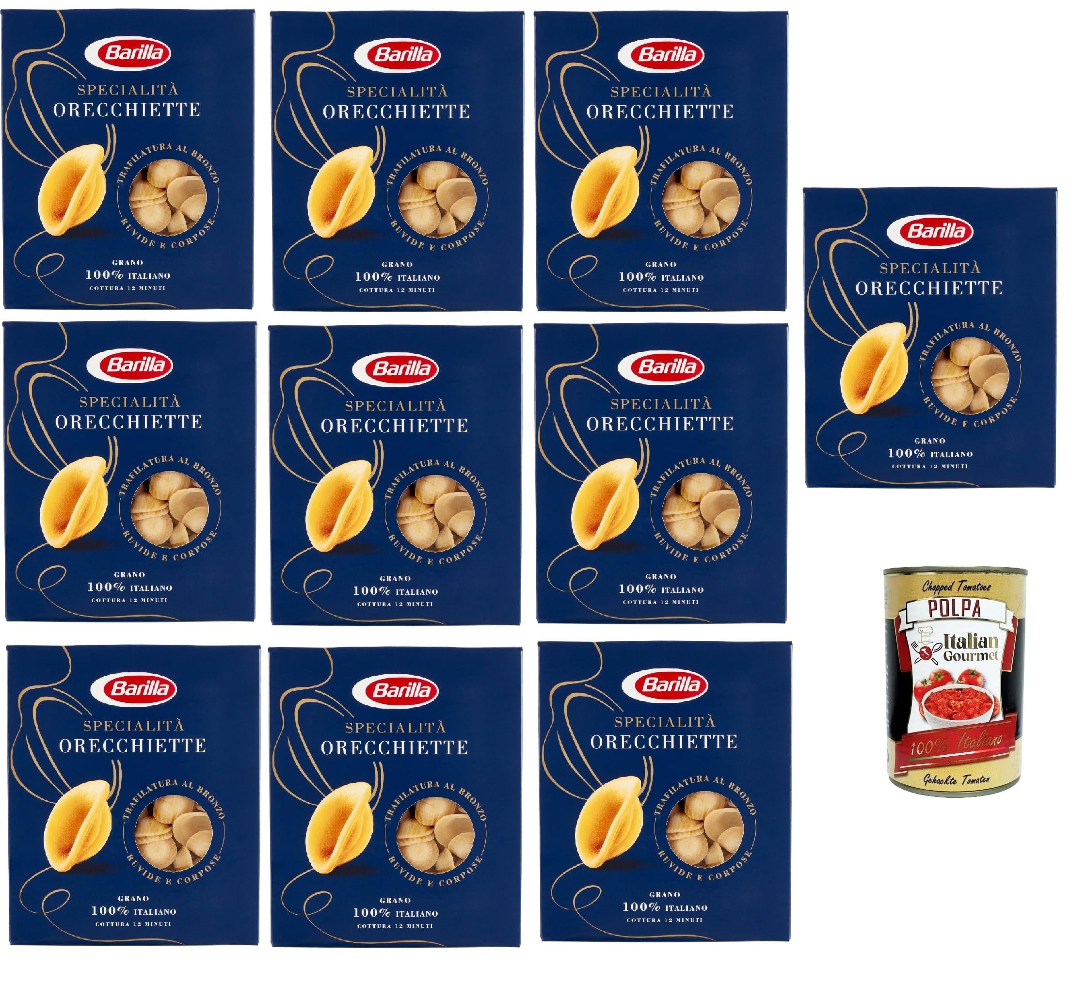 10x Pasta Barilla Specialità Orecchiette Pugliesi, 100 Italiaanse noedels 500 g pak Italiaanse gourmet polpa 400 g