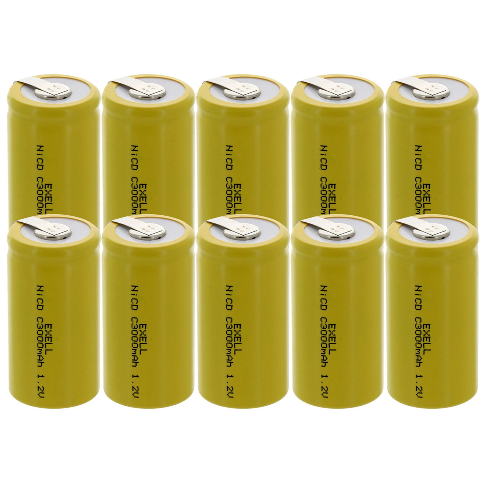Exell C Size 1.2V 3000mAh NiCD Rechargeable Battery with Tabs Exell C Size 1.2V 3000mAh NiCD NiCD Rechargeable Battery with Tabs are excellent for building custom battery packs. If you are a novice or an old pro, these batteries will keep you powered up. These batteries can be recharged 500-1000 times giving you years of use. These high quality rechargeable Nickel Cadmium (Ni-Cd) batteries are exact Compatible Withs for standard battery in all the device. Provides ultra long use time per charge. Designed for enhanced performance for high drain applications such as digital cameras, CD players, portable audio devices, hand held games, 2-way radios, PDAs, and other portable high drain digital electronics. Can be recharged for up to 700 times, providing big saving by replacing hundreds of throw away batteries. Can be rapidly charged with any quick charger, smart chargers, plug in charger or universal chargers. Consumer Applications: Widely used in radio controlled devices, electric tools and toys, electric mopeds, meters, two radios, hybrid automobiles, electric razors, toothbrushes, cameras, camcorders, mobile phones, pagers, instruments/equipment, high power static applications (Telecoms, UPS and Smart grid), and numerous other applications. Exell C Size 1.2V 3000mAh NiCD NiCD Rechargeable Battery with Tabs Specifications Voltage: 1.2V, Amperage: 3000mAh, Chemistry: Nickel Cadium (NiCD), Height: 1.93in, Diameter: 1.00in, Terminal Types: Tabs, NiCD Assembly Cell Battery Information Excellent quality and provide constant power electric current for your power hungry devices and some solar lights and solar applications., Low internal resistance, ideal for rapid high current discharge, Excellent battery cycle life: 1000 times, Ni-Cad battery can be charged and discharged for up to 1000 times, Environmentally Friendly (Ni-Cad can be recycled), If use once a day, Ni-Cad batteries can last up to 3 years.CROSS-REFERENCE: Before ordering this battery backup, be sure to check that the product is compatible with the battery's chemistry, size, amperage, polarity, and voltage. RECHARGEABLE BATTERY: Designed to provide long-lasting power, these tab-terminal batteries can be recharged 500 - 1000 times, giving you years of use. They'll give your high-power devices such as flashlight, radios, solar devices, and more plenty of life. HIGH-QUALITY BATTERY: Made from Nickel Cadmium (NiCD), these rechargeable batteries feature a voltage of 1.2V.They're designed for use in a wide variety of high-tech applications and are built to last. Voltage: 1.2, Amperage: 3000mAh, Chemistry: NiCAD.