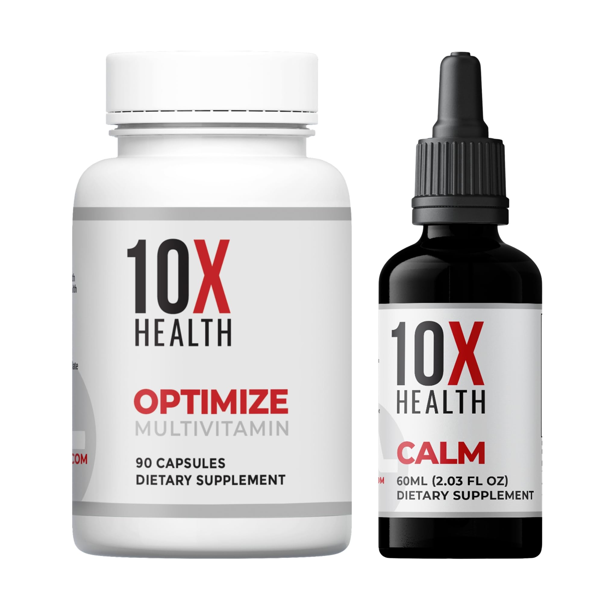 Set your day up right with the 10X Health Optimize Calm Bundle. Start the morning with Calm (AM), a caffeine-free liquid featuring Suntheanine L-theanine (100 mg), GABA (100 mg), and Huperzia serrata extract (50 mcg, 1 Huperzine A). Use the included dropper for quick, consistent measuring. Pair it with Optimize, our once-daily multinutrient taken in 3 capsules per serving. Each 30-day supply provides broad vitamin and mineral coverage, Vitamin D3, K (phytonadione MK-7), methylfolate (L-5-MTHF), B-complex, zinc, magnesium, plus focused extras including N-acetyl-L-cysteine, Coenzyme Q10, alpha-lipoic acid, DIM, and carotenoids lutein zeaxanthin. Use them together to keep your AM ritual simple and your daily essentials in one place.How to use: Follow each label's directions. Many customers take Calm on waking and Optimize with breakfast or lunch as part of a daily routine. What you get: Optimize with 1-3 month supply and Calm with 30 servings and a measure-mark dropper. Clear labels and straightforward ingredient lists. Calm Liquid Drops: Features Suntheanine L-Theanine 100 mg, GABA 100 mg, Huperzia serrata extract 50 mcg (1 Huperzine A) a flavored, caffeine-free dropper made for easy morning use. Optimize daily support: A full-spectrum of vitamins minerals including Vitamin D3 100 mcg, Vitamin K (phytonadione MK-7), methylfolate (L-5-MTHF), B-complex, zinc, magnesium, plus extras like N-acetyl-L-cysteine (145 mg), CoQ10 (50 mg), alpha-lipoic acid (50 mg), DIM (50 mg), lutein zeaxanthin, and BenfoPure benfotiamine. Simple routine: take Calm in the morning (AM) and Optimize with your first meal to keep your day consistent and easy to follow.