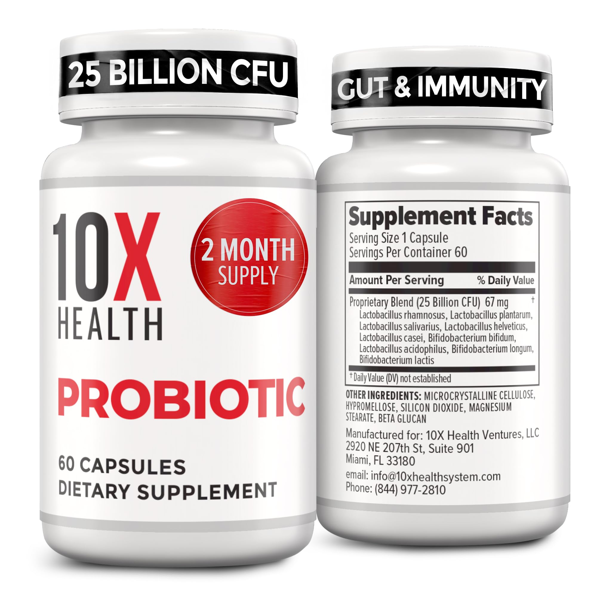 Quality and Safety Focused: The 10X lactobacillus probiotic supplement from 10X Health System is proudly made in the USA using premium, carefully sourced ingredients. Each batch undergoes rigorous quality and purity testing, ensuring your wellness. Digestive Wellness Regularity: Experience gentle support for your digestive health with 10X Health Probiotic Capsules. Our proprietary probiotic blend promotes healthy digestion, supports regular bowel movements, and is free from common allergens. Promotes Overall Well-Being: Crafted with carefully selected probiotic strains, these probiotic nutritional supplements support balanced gut health, which is crucial for overall well-being. Made with hypoallergenic ingredients suitable for daily use. Boosts the Immune System: This mens probiotic contains 25 billion CFU per serving to significantly support gut health for men and the immune system by fostering beneficial microorganisms. This probiotic for men helps support your overall wellness. Supports Gut Health and Balance: 10X Probiotics combine three probiotic strains: Bifidobacterium longum, Lactobacillus rhamnosus, and Lactobacillus acidophilus, to support digestive health and help lessen occasional bloating after meals.
