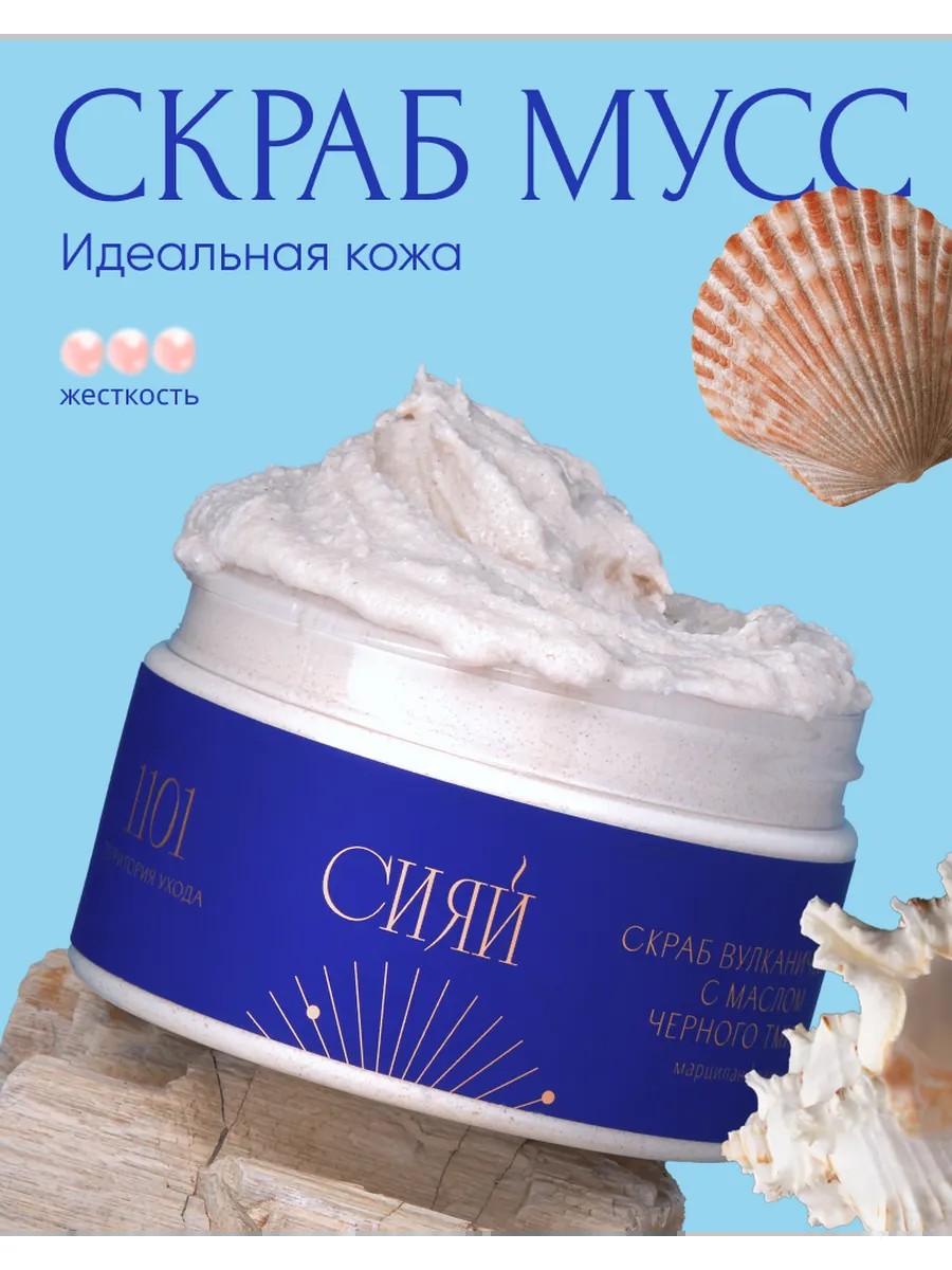 Профессиональный уход с органической косметикой «1101 Территория ухода». Парфюмированный солевой скраб «СИЯЙ» – идеальное сочетание мягкости и эффективности в борьбе за совершенство кожи тела. Натуральный соляной антицеллюлитный скраб обновляет, увлажняет кожу, очищая и пилингуя, обновляя и отшелушивая ороговевшие клетки. Благодаря усилению микроциркуляции в клетках имеет жиросжигающий эффект, выравнивая и подтягивая рельеф. Жесткий благодаря частицам пемзы скраб с мягкой формулой бальзама хорошо полирует и борется с вросшими волосами и прыщами от них. Масляная текстура питает и смягчает. Нежный аромат пачули и марципана дарит расслабление и остается на теле гурманским шлейфом. В состав входит мощный антиоксидант тимохинон, который в комплексе с витамином Е, глицерином и оксидом цинка преображает кожу: питает и обогащает клетки, активизирует выработку естественного коллагена и эластана, регулирует водный баланс и выводит лишнюю жидкость, нормализирует липидный обмен, помогает в борьбе с высыпаниями. Масло ши питает глубокие слои кожи, масло кокоса создает защитную пленку. Морская соль и вулканическая пемза создают обволакивающую текстуру, которая скрабирует и оставляет кожу чистой и гладкой. Этот лимфодренажный скраб станет лучшим помощником при похудении, ведь он способствует подтяжке тела в домашних условиях. Наносите скраб мусс массажными движениями на влажную кожу, начиная с ног и далее вверх по лимфе для борьбы с несовершенствами кожи тела, а также на зоны стоп, пяток и рук. Кожа станет мягкой и нежной уже после первого применения. Максимальный эффект - через 21 день. Скраб улучшает рельеф и тон, уменьшает растяжки, повышает упругость. Подходит для проблемной, жирной и комбинированной кожи тела, на сухие атопичные учатки наносить скраб с особой осторожностью. Баня и сауна отлично сочетается с процессом пилинга, рекомендуем брать с собой для SPA ритуалов.