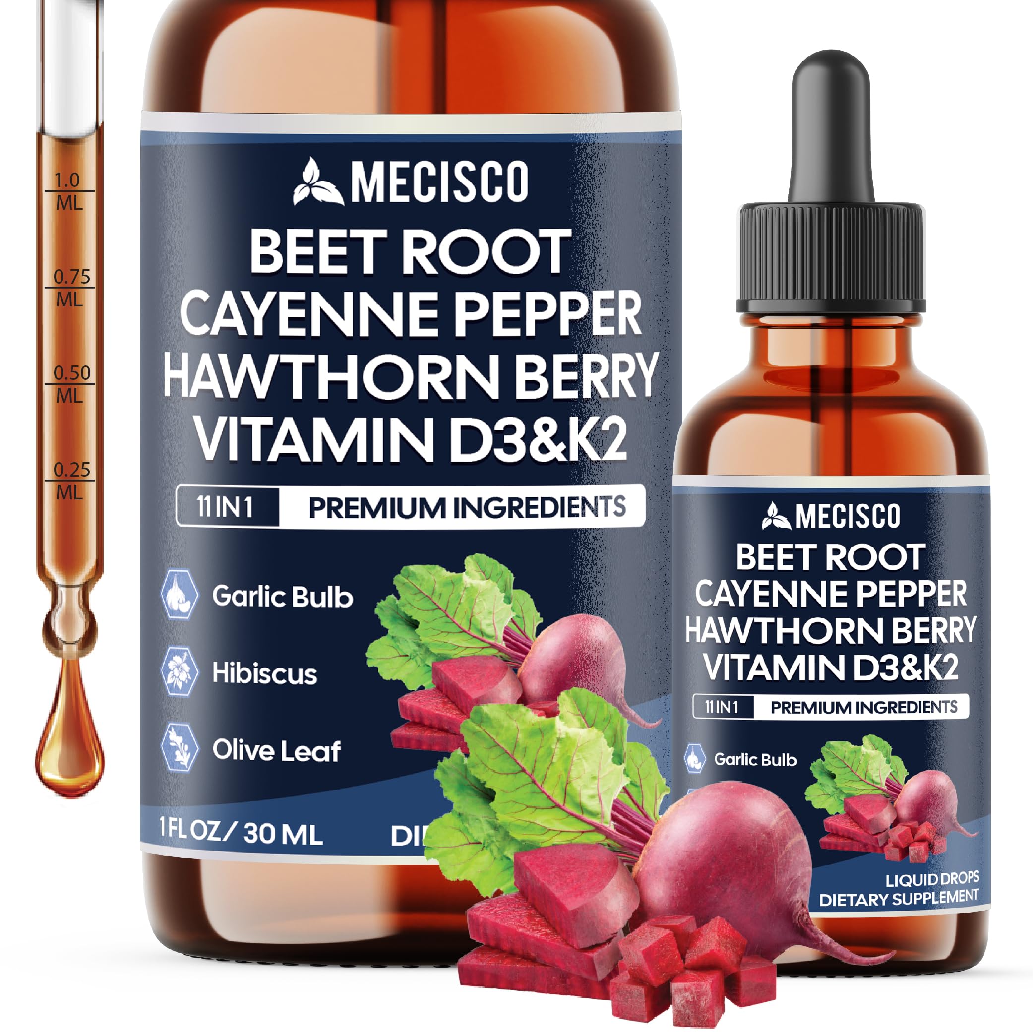 ✓ Satisfaction Guaranteed: Mecisco Bottles are a comprehensive refund policy. Our mission is to offer our customers beneficial supplements of high quality. If, for any reason, you are dissatisfied with your order, please don't hesitate to reach out to us to request a refund. Your satisfaction is our top priority. ✓ Outstanding Value: All Mecisco Supplement is sourced from a trusted certificated facility manufacturer by strict processes to ensure international quality standards such as cGMP, ISO, FDA Registered facility USA verified Laboratory. ✓ Easy Daily Use: Take 0.5ml of Beet Root Supplements daily. Each 30ml bottle of provides a 2-month supply, easy to take directly or mix into your favorite beverage. ✓ Our 11in1 Beet Root Extract combines eleven carefully selected ingredients, thoughtfully included to complement your daily wellness routine. The blend supports immune system function, heart health, circulation, and daily energy. ✓ Key Ingredients: Blend of Beet Root, Vitamin D3, Vitamin K2, Cayenne Pepper Drops, Hawthorn Berry Extract, Garlic, Hibiscus, Olive, Red Spinach, Green Tea, and Ginseng for to support overall wellness.
