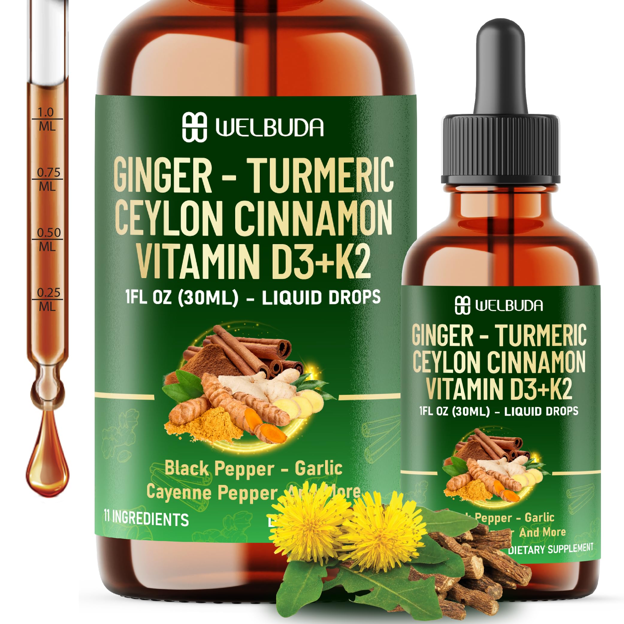 11in1 Ginger Root Supplement with Turmeric Ceylon Cinnamon Black Pepper Cayenne Pepper Berberine Vitamin D3 and Vitamin K2 - Support Immune Energy - 1 FL Oz - 2 Month Supply