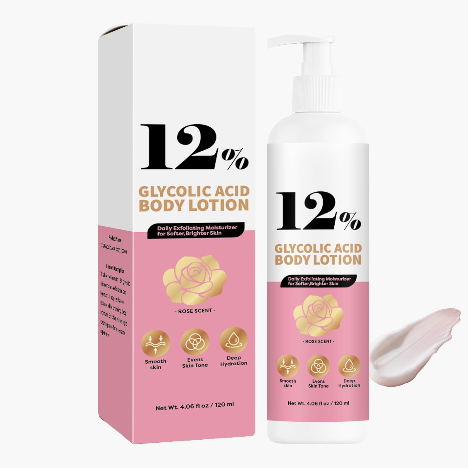 v Name: 12 Glycolic Acid Body Lotion v Net Weight: 4.06 Fl Oz 120ml v Features: Gently exfoliates, smooths rough skin, brightens dullness, deeply hydrates. v Suitable For: All skin types, daily body care, improving skin texture. ? Gently exfoliates with 12 AHA ? Smoothes rough, bumpy skin ? Revitalizes dull skin for a radiant look ? Provides deep, lightweight hydration ? Refines skin's overall texture ? Quick-absorbing, non-greasy formula