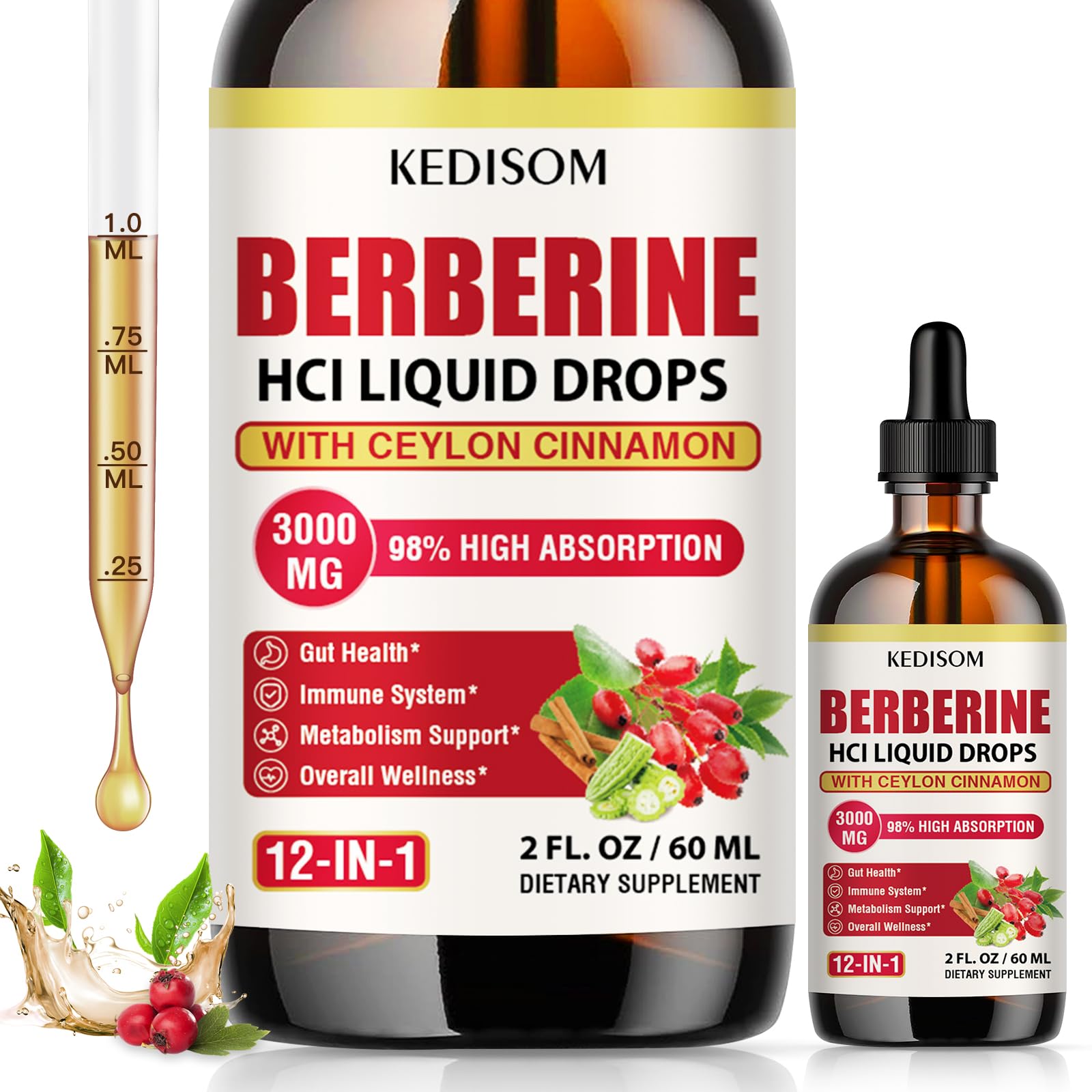 12-in-1 Berberine Supplement Liquid Drops 2 Fl Oz, 3000mg Liposomal Berberine HCL Complex with Ceylon Cinnamon Plus Turmeric, High Absorption Berberine Drops 2 Fl Oz (Pack of 1)