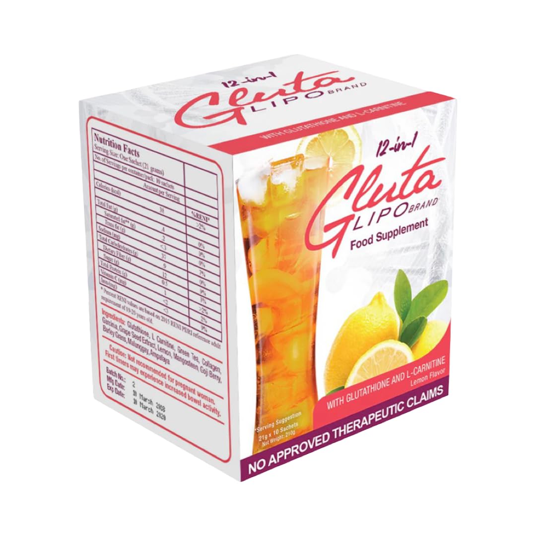 1 Box packed with 10 sealed sachets (21g each). 12-in-1 Glutalipo Juice Lemon Flavor containd 12 natural main ingredients. Rich in Vitamin C.
