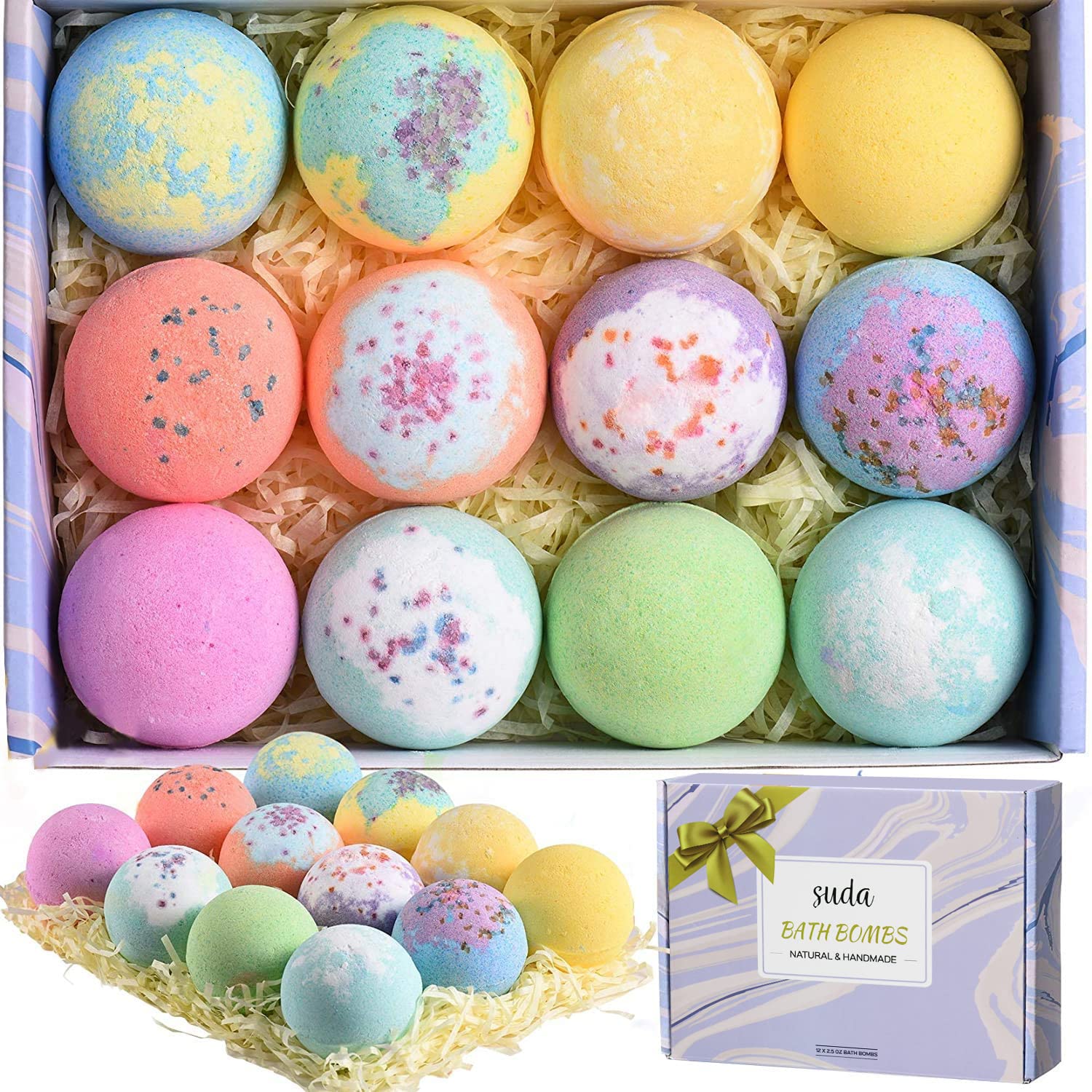 12 Colorful Bath Bombs Set: Freesia, Neroli, Gardenia, White-Tea, Jasmine, Ylang Ylang, Cherry Blossom, Lavender, Eucalyptus & Tea Tree, Chamomile, Papaya&Mango, and Forget-me-not will bring you lasting fragrance.BEST GIFT CHOICE: Each of these bath bombs are individually wrapped and exquisitely packed, making it a perfect gift for anyone like wife, mom, kids, friends. Ideal for Valentine's Day, Mother’s Day, Birthday, Christmas, Anniversary, Wedding, and other occasions. NEVER STAIN YOUR BATHTUBE: Cut the plastic wrap with the included tool, fill your bathtub with warm water, drop in the essential oil bath bombs, lie back, and enjoy the bath. Snugome bath bombs leave no residue on your tub or skin after bathing. Tips: recommend to clean the bathtub after each use. FIZZY BUBBLE: Have trouble in bathing your child? Snugome fizzy bath bombs will help you out. Drop the cute bath bombs into the bathtub, during this fragrant bath bomb fizzes, the water will turn soft and creamy. Making bath time more enjoyable than ever for your kids. NOURISHING SKINCARE: Each bath bomb of Snugome are handmade and contain pure essential oils, Sea Salt, Shea Butter, and other beneficial materials, bring you a luxurious SPA treatment at home. You will get smooth, moisturized, fragrant, and soft skin after use., all ingredients are organic. Pamper your sensitive skin with a home spa - like experience. 12 pcs bath bombs: Snugome bath bombs gift set comes with 12 different floral scents, including Freesia, Neroli, Gardenia, White-Tea, Jasmine, Ylang Ylang, Cherry Blossom, Lavender, Eucalyptus & Tea Tree, Chamomile, Papaya&Mango, and Forget-me-not. Each one with 2.5oz (71g) is larger than a golf - ball. Freely experience the floral scent and refreshing features of the garden at home!.