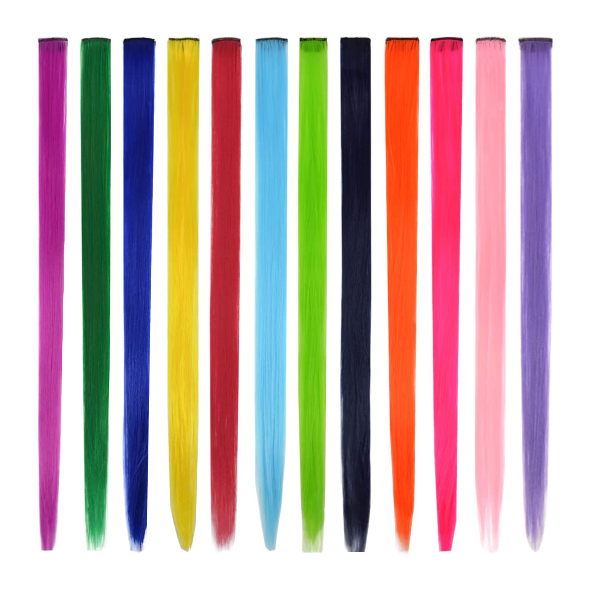 fiber, look, move and feel like real hair.Size: The length of the colored hair extension is approx. 22 inches, the width is approx. 1.4 inches, is suitable for most people and can also be cut to a suitable length.Color: 12 pieces of colorful set straight.Tipps: Aufgrund des Unterschieds in Licht und Anzeige kann es zu Farbunterschieden zwischen Bildern und echten Produkten kommen. Wenn Sie irgendwelche Bedürfnisse/Fragen/Probleme mit dem Produkt haben, senden Sie uns bitte eine E-Mail. Wir werden Ihnen die beste Hilfe bieten und Ihnen den zufriedenstellendsten Kundenservice und die zufriedenstellendsten Lösungen bieten. Vielseitig Verwendbar: Farbige Haarverlängerungen bestehen aus hochwertigen Clips, voller Vitalität, weich und einfach zu installieren. Es ist die erste Wahl für Partys, Veranstaltungen, Karneval, Musikfestivals, Konzerte, Clubs und den täglichen Gebrauch. Material: Farbige Haarverlängerungen bestehen aus hochwertiger Kunstfaser, sehen aus, bewegen sich und fühlen sich an wie echtes Haar. Größe: Die Länge der farbigen Haarverlängerung beträgt ca. 22 Zoll, die Breite beträgt ca. 1,4 Zoll, ist für die meisten Menschen geeignet und kann auch auf eine geeignete Länge geschnitten werden. Farbe: 12 Stück Buntes Set -gerade.