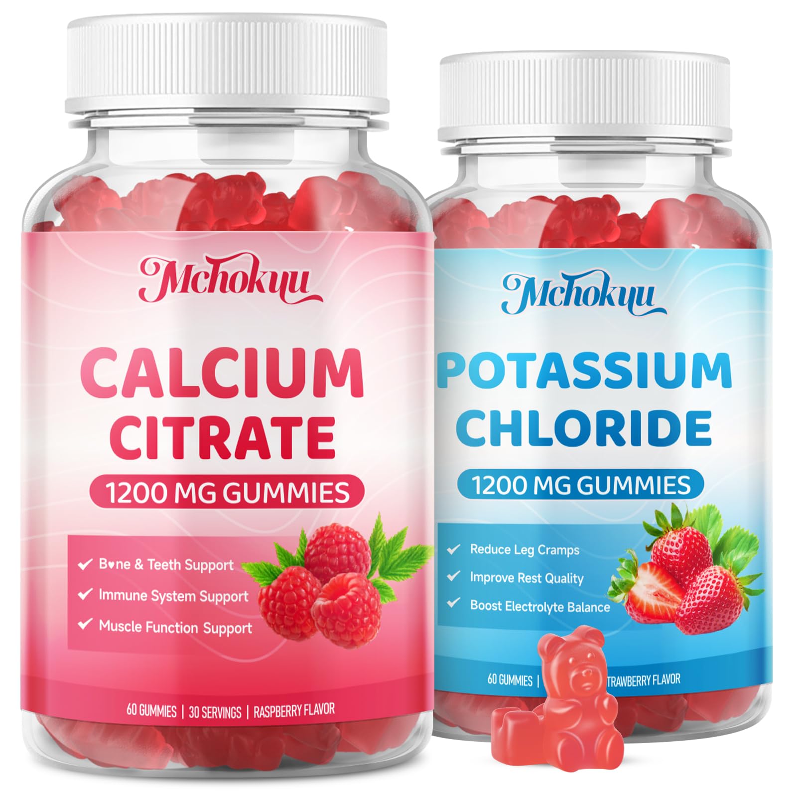 1200mg Calcium Citrate Potassium Chloride Gummies Raspberry Strawberry Flavor, 120 Counts Bundle.