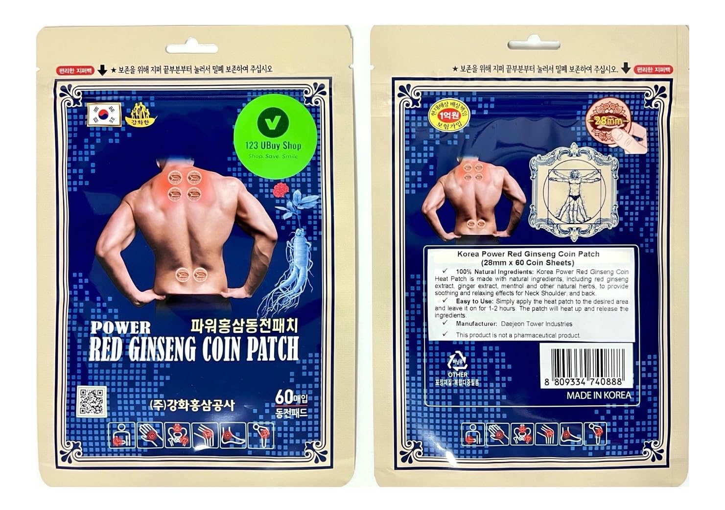 Thank you so much for visiting 123 UBuy Shop!. Easy to Use: Simply apply the Coin heat patch to the desired area and leave it on for 1-2 hours. The patch will heat up and release the ingredients. 100 Natural Ingredients: Korea Power Red Ginseng- Coin Heat Patch is made with natural ingredients, including red ginseng extract, ginger extract, menthol to provide soothing and relaxing for Neck, Shoulder, Back, Hand, Knees, Ankle.