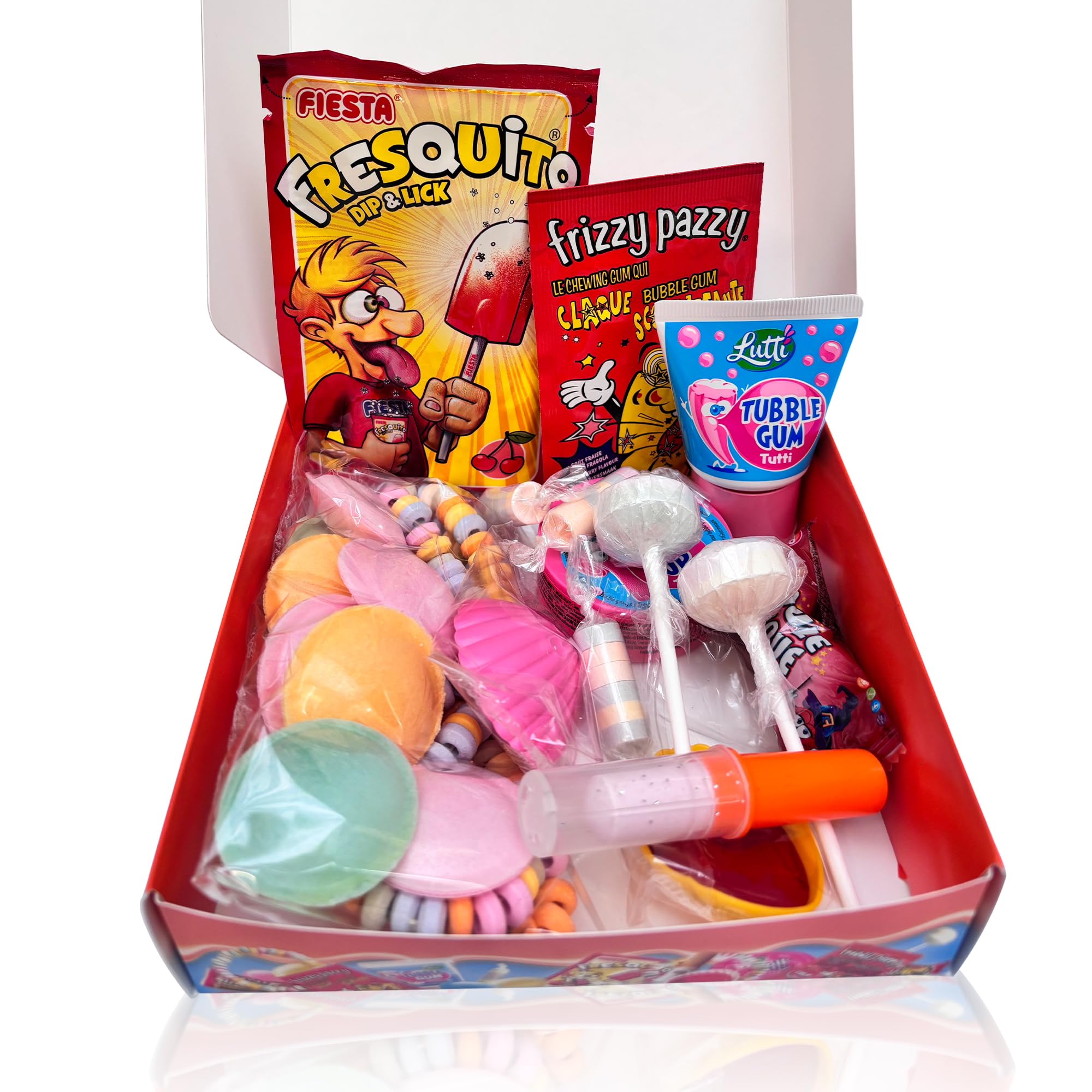 A fantastic design for a box featuring iconic candies from the 80s. Perfect for gifting and introducing or reintroducing your childhood favorites! Box contents: Necklaces - Tutti Gum Tubes - Roudoudous - Fizzy Rolls - Tutti Roll-Up Gum - Frizzy Pazzy Strawberry - Frizzy Pazzy Cola - Cola Magic Balls - Red Berry Magic Balls - Fresquito Cherry - Sour Saucers - Lollipops INGREDIENTS Candy INSTRUCTIONS Warning: Contains small parts which may present a choking hazard. Not suitable for children under 3 years. Use under adult supervision. MANUFACTURER'S DETAILS PVG DIFFUSION, 710 avenue de la Quiera, 06370, Mouans Sartoux, France See more