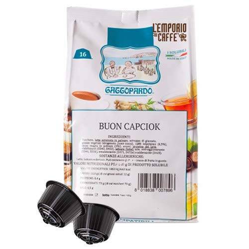 DESCRIPTION DU PRODUIT Gattopardo Capciock compatible Dolce Gusto est une boisson à la saveur de cappuccino, enrichie du chocolat, très dense et gourmande. Seulement le café, le lait entier en poudre et cacao donnent vie à une boisson vraiment unique, parfaite pour votre petit déjeuner avec sa mousse de lait crémeuse. Ingrédients : Sucre, extrait sec de camomille (2,9 ), stabilisant : caoutchouc arabe. Il peut probablement contenir des traces de lactose, des gluten et des fruits en cose.