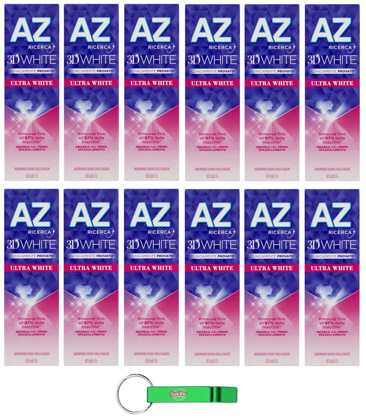 12x Dentifricio AZ 3D White Ultra White toothpaste with whitening effect 65ml + Beni Culinari Free keychain