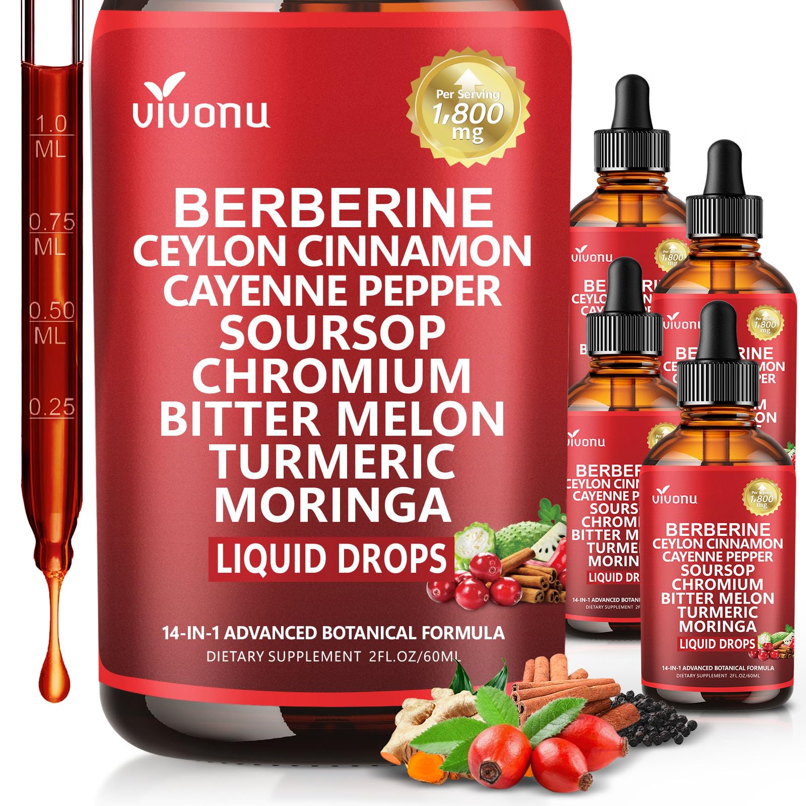 30-Day Supply – 1800mg Per Serving: Each serving (2 ml) provides 1800 mg equivalent botanicals, with 30 servings per 2 fl oz bottle. A concentrated berbine supplement solution to fuel daily wellness using compact liquid dosing. Nutrient synergy with black pepper for better absorption: Contains black pepper extract 95 to enhance ingredient uptake supports circulatory health. easy-to-take liquid format makes this berberine supplement convenient for both men and women. Easy-to-Use Liquid Drops: The Convenient berberine drops format makes it easier for the body to utilize nutrients. A great alternative to cayenne pepper drops or soursop bitters liquid, especially for those looking for quicker absorption without capsules. Supports Energy Metabolic: This advanced blend helps maintain metabolic activity, promote balanced vitality, thanks to ingredients like Berberine, cayenne pepper supplements, bitter melon, cinnamom, soursop, moringa supplement and turmeric. 14-in-1 Herbal Complex: Each serving delivers 1800 mg active extract, including Organic Berberine, Organic Ceylon Cinnamon, Turmeric, Bitter Melon, Cayenne Pepper, Apple Cider Vinegar, Black Pepper, plus, Soursop, Glucomannan, Gymnema Sylvestre, Moringa—berberine complex. Liposomal Delivery for Higher Efficiency: Our liposomal liquid drops help support faster absorption, allowing key ingredients such as berberine and Ceylon cinnamon to work more effectively. Designed for individuals seeking a high-performing berberine supplement berberine with Ceylon cinnamon to support daily wellness.