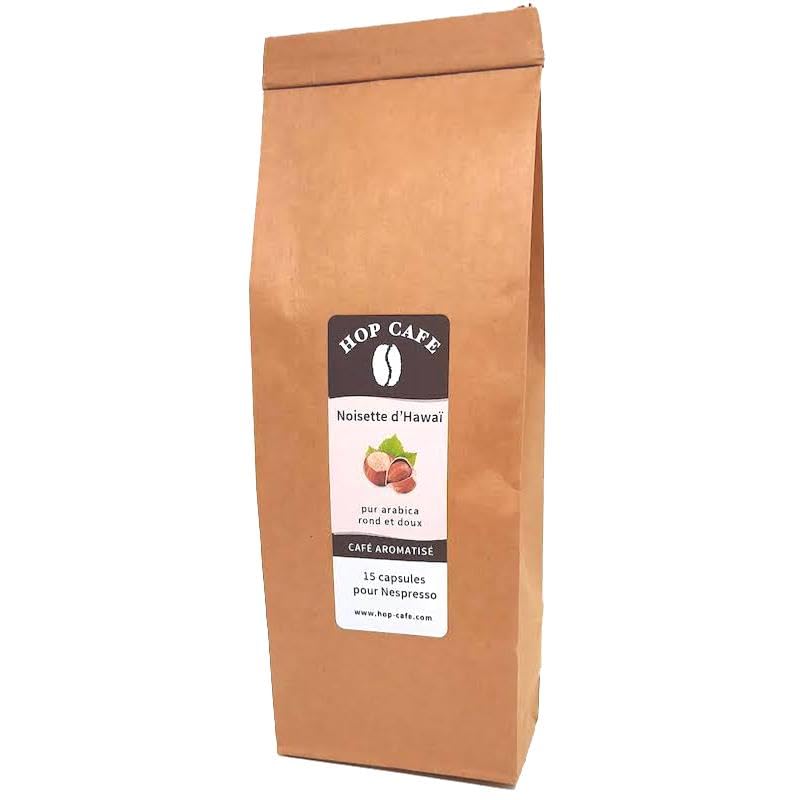 Bag of 15 compatible capsules. A successful combination of hazelnut flavor and a round, smooth coffee, to be enjoyed with a square of dark chocolate.OK Home Compost certified compostable capsule. A successful combination of hazelnut flavor and a smooth, rounded coffee, to be enjoyed with a square of dark chocolate. Bag of 15 compatible capsules of pure Arabica coffee flavored with Hawaiian Hazelnut. Sachet de 15 capsules compatibles. Mariage réussi entre le parfum de noisette et un café rond et doux, à déguster avec un carré de chocolat noir.Capsule compostable certifié OK Home Compost. Mariage réussi entre le parfum de noisette et un café rond et doux, à déguster avec un carré de chocolat noir. Sachet de 15 capsules compatibles de café pur arabica aromatisé Noisette d'Hawaï.