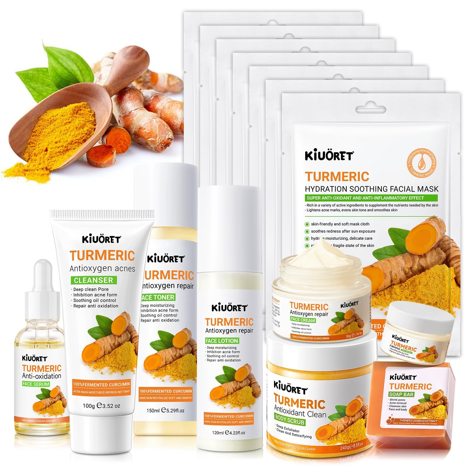 Thoughtful Skincare Gift For Every Occasion: Our turmeric skincare set, with a gentle formula suitable for all skin types, is a wonderful present for your loved ones. The all inclusive 15 piece set provides a complete skincare routine, making it a practical yet luxurious gift for birthdays, holidays, or simply to express your affection. Long - Lasting Hydration: Our unique formula is engineered to offer long - lasting moisture. It forms a protective barrier on the skin, locking in essential moisture throughout the day. Say goodbye to dry, flaky skin and hello to a soft, supple complexion that stays hydrated around the clock. Powerful Acne Removal Formula: Turmeric skincare kit reduces acne by deep cleansing and unclogging pores. It also regulates sebum production to ensure your skin stays balanced and reduces acne flare-ups. Teenage boys and girls suffer from acne, our kit can make your skin cleaner and healthier. Turmeric Vitamin Synergy: Cold-pressed turmeric extract works synergistically with Vitamin C (collagen booster) and Vitamin E (UV protector) to target dryness, acne, wrinkles, and dullness for long-lasting hydration and youthful-looking skin. Complete 15-Piece Turmeric Set: This all inclusive skincare set contains turmeric cleanser, soap, scrub,toner, face oil, eye cream, lotion, cream and 7 hydrating face masks. It provides a full spectrum skincare routine, allowing you to pamper your skin from head to toe.