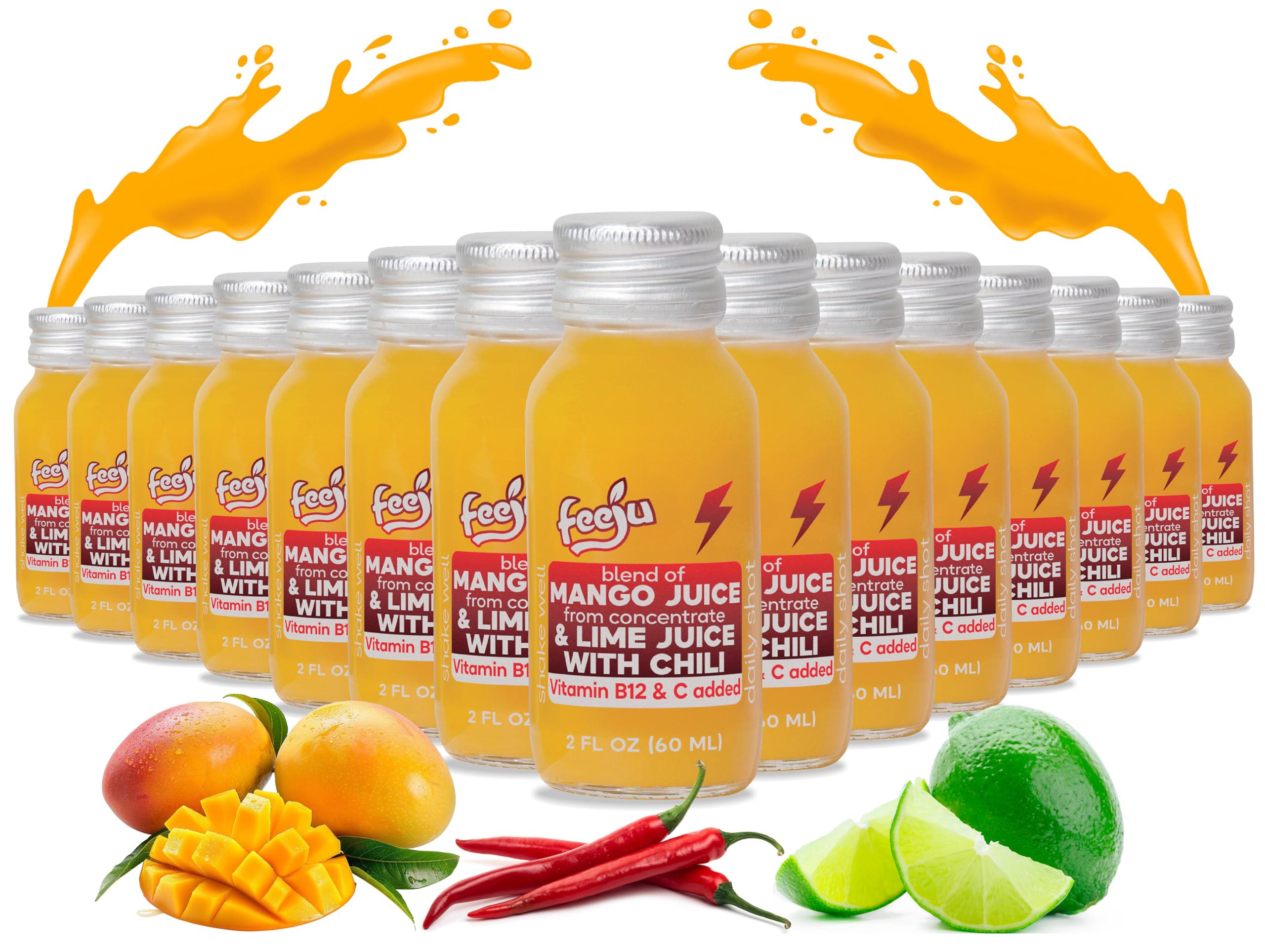 : Boost your day with this wellness drink that combines fruity sweetness, citrus freshness, and gentle spice. Known for antioxidant and antihistamine activity, natural anti-allergic properties, it helps refresh, energize, support immunity, and contribute to clear skin. : Our functional juice mango is made with over 80 juice content and carefully pasteurized. This wellness drink is designed for both flavor and safety. Only natural flavors from real fruits and ginger. Store in a cool place. Once opened, keep refrigerated and consume within 7 days for best freshness. - : Stay refreshed anytime with our mango drink shots pack of 15 bottles, each 2 fl oz (60ml). Perfectly portioned for on-the-go lifestyles, whether at the office, gym, travel, or as a quick pick-me-up. Easy to carry and ready to drink whenever you need it. : This functional juice mango shot is fortified with Vitamin C and Vitamin B12 to support energy and immune health naturally. Each 2 fl oz serving provides 90 DV Vitamin C and 100 DV Vitamin B12, making it a smart addition to your wellness routine. : Enjoy the refreshing taste of our mango nectar blend, crafted with grape juice, mango puree, lime juice, ginger root juice, and a hint of chili. A unique balance of sweet, tangy, and spicy flavors in a convenient 2 fl oz shot for daily vitality.