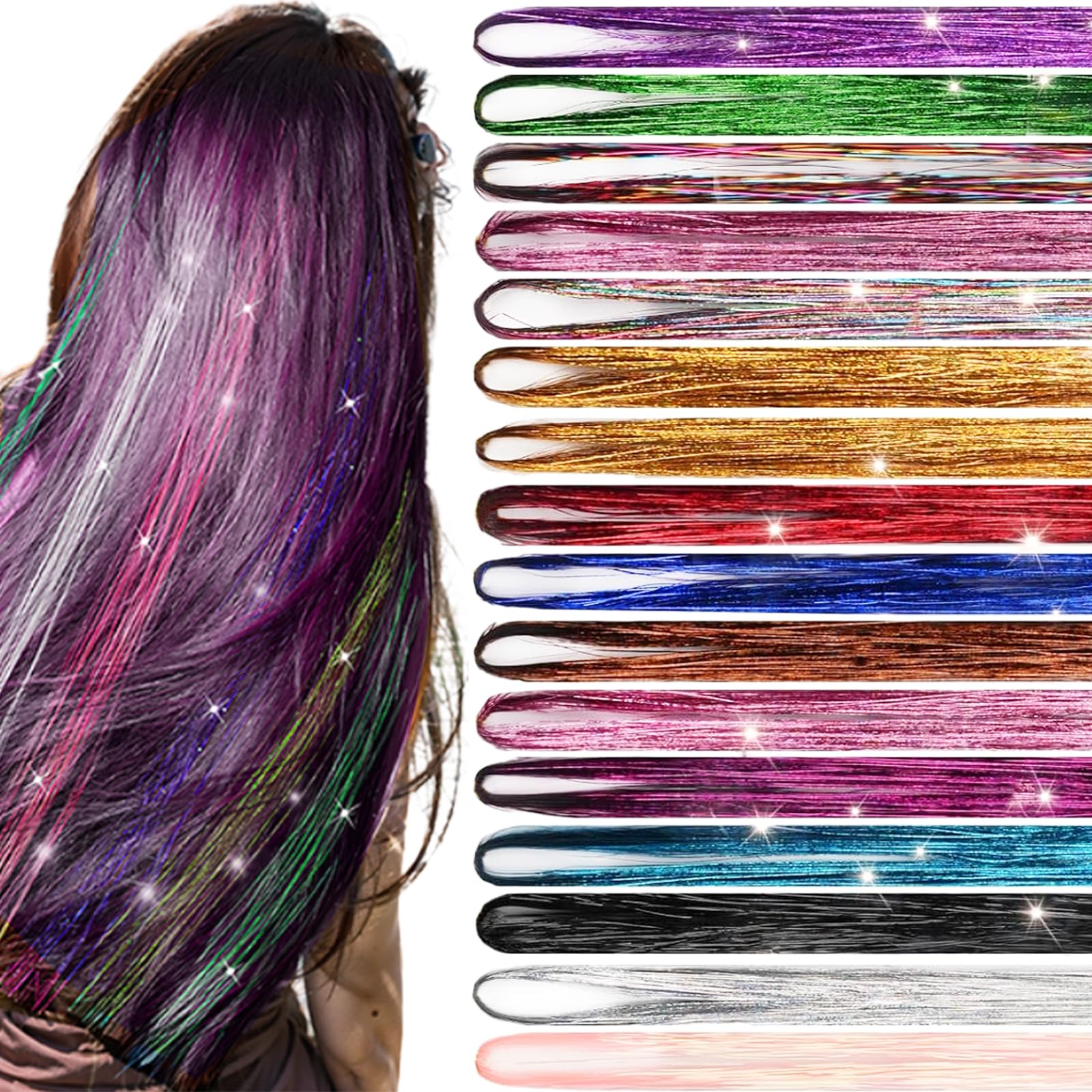 16 Colors Hair Tinsel Extensions, Glitter Shiny Colorful Hair Tinsel Kit Straight Hair Extensions Party Cosplay Rainbow Synthetic Hair Extensions for Women Girls, 37 Inches DIRECTIONS Tie a knot and fix tinsel hair on your head, tinsel hair can last several weeks, even suffer from washing, drying, and flat ironing.