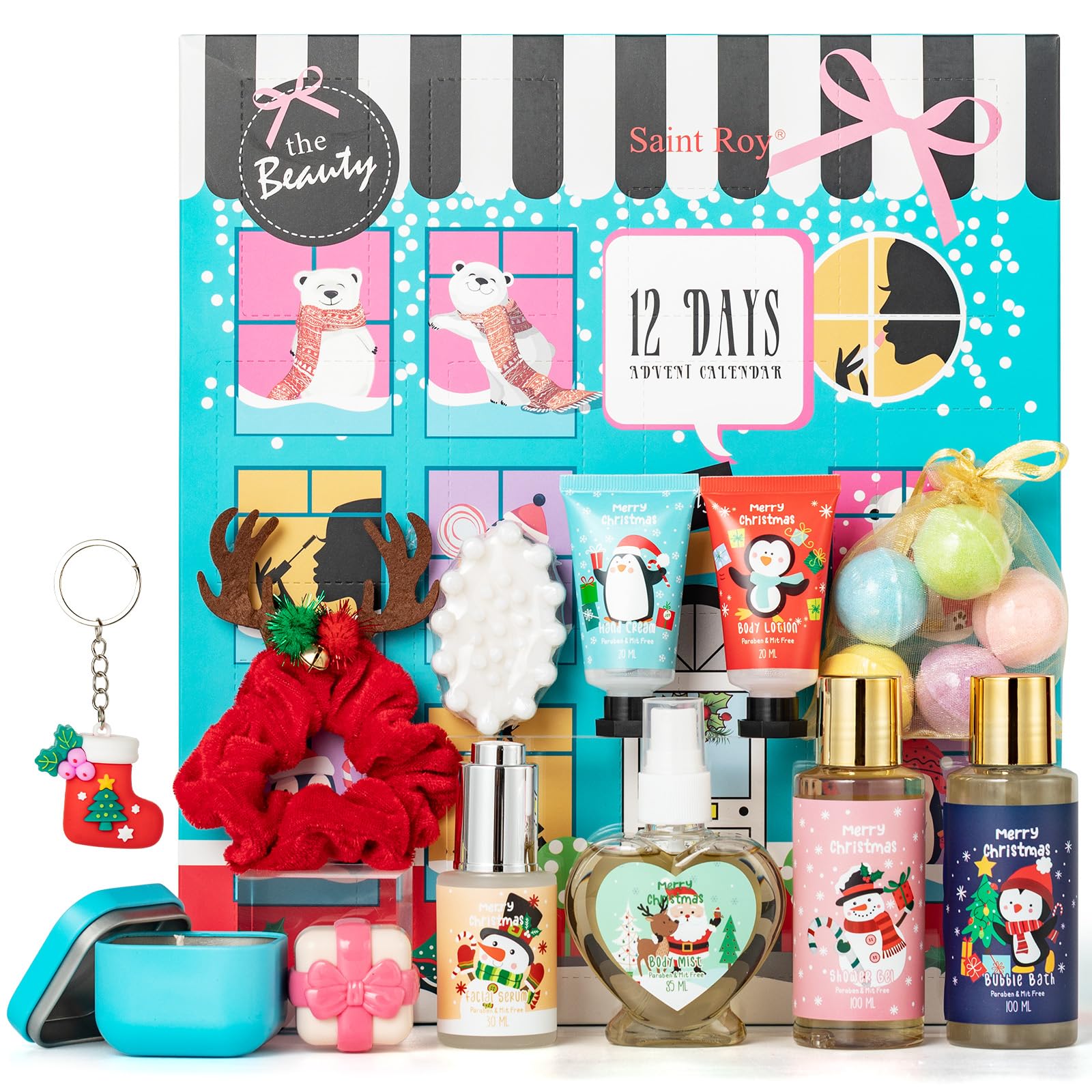 Handy Accessories, Life's Little Helpers Beyond skin and body care, this care package for her also includes handy accessories like durable hair ties and stylish keychains. The hair ties are made from high-strength material that keeps your hairstyle in place, while the keychains add a touch of elegance to your daily ensemble. The Perfect Gift: Ideal for friends, family, or yourself, this bath gift set makes a thoughtful present for Christmas, birthdays, or any special occasion, bringing comfort and joy to every recipient. Premium Materials, Gentle on the Skin Nourishing Ingredients: Crafted with skin-loving ingredients like shea butter, essential oils, and vitamins, each product in this spa set softens and hydrates, offering a soothing, refreshing experience. gentle on all skin types. From cleansing to moisturizing, we've got you covered. Comprehensive Contents, All in One Box Christmas Pampering: Indulge in our holiday bath gift set with everything needed for a luxurious home spa experience - The Spa kit include Shower Gel, Bubble Bath, Hand Cream, Body Lotion, Body Mist, Facial Serum, Soy Candle with Rose Flower, ,Bath Soap, 5 pieces 15g Bath Bomb, Organza Bag, christmas Hair Band, Lip Balm, christmas Key Chain, Beautiful Surprise Box. Everything you need for a luxurious self-care experience is right here. Multi-Purpose Box, Full of Fun This gift set is not just for skin care. It's a treasure trove of items that are both practical and fun with the personal care products . From nourishing hand cream and body lotions to 5 piece color bath bomb and stylish keychains, every item brings a new level of joy to yours daily routine. Beautifully Packaged: Elegantly presented and ready to gift, this set is perfect for women who have everything, adding a festive touch with no extra wrapping needed. Luxury Variety, Surprises in Every Box Are you still struggling to choose a gift? Pick this spa funny gifts Advent Calendar 2025 Christmas Gifts! The Advent Calendar Luxury 2025 Gift Box for Christmas mystery gift box showcases a unique design, with each inner gift box holding a hidden surprise. The contents in the gift boxes are diverse and luxurious, ranging from skincare to lip balm supplies and daily essentials. Its perfect as self care gifts for women, girls, mom, best friends and any your loved one!.