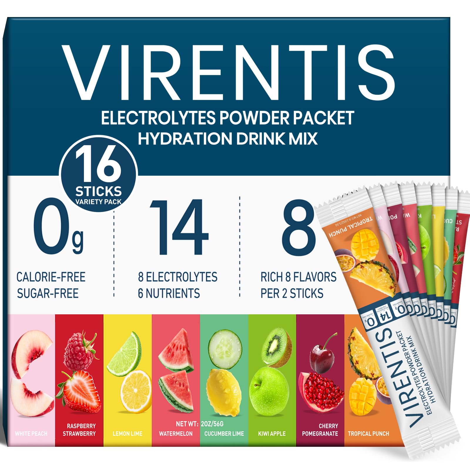 Convenient Use Friendly Service: Mix 1 stick pack with 16 oz of water to find your favorite taste, shake or stir until dissolved, ready to drink, iced is better taste. Warm Tips: Please add water first, then pour in the electrolytes powder packets shake or stir to dissolve faster! If you're not satisfied with our product, feel free to contact us anytime. We offer 24h service and can arrange for replacements or full refunds without the need for return. Portable Packets Easy to Use: The 16 sticks electrolyte packets with an independent portable packet design contains multiple flavors mixed pack. It is lightweight and adopting an easy to tear film packaging design, it can be torn open immediately and suitable for outdoor sports, travel, high-temperature operations, and other scenarios.It's the perfect addition to your travel essentials, cruise essentials, party favors. Say goodbye to the tired body with our cheers after hydrating. Multidimensional Nutrition Health Adaptation: The electrolytes powder no sugar can prevent dehydration,fatigue by high-intensity exercise, travel or busy work, which can quickly rehydrate, balance body fluids, speed up recovery and keep you energized.support cellular energy metabolism and regulate bodily functions. It is suitable for high-temperature environment workers such as firefighters and construction workers, as well as people who pursue a vibrant life. 8 Fruit Flavors Deliciously Refreshing: Our hydration packets sugar free have rich 8 fruit flavors, 2 sticks per 8 flavor including: lemon lime,watermelon,raspberry strawberry,white peach,cucumber lime,kiwi apple,cherry pomegranate,tropical punch flavors of mango, pineapple, passion fruit.The taste is refreshing,neither sweet nor salty, Simultaneously meeting various dietary needs such as keto, vegetarian, and low-carbon water, non GMO, gluten free etc. Energy Supplementation Efficient Hydration: Our sugar free electrolytes that helps to replenish lost water in our body quickly. It contains essential 8 electrolytes and 6 nutrients like Sodium,Calcium, Potassium,Zinc,Magnesium,Niacin,Pantothenic Acid,Phosphorus,Manganese,Chloride,Vitamin C,Vitamin D,Vitamin B6,Vitamin B12.Achieve a hydration efficiency three times higher than ordinary water,relieving dehydration symptoms,supporting the body to quickly recover energy.